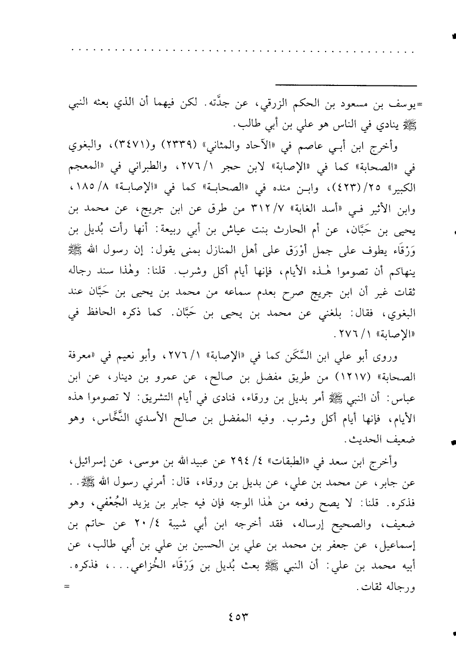 فذكره. قلنا: لا يصح رفعه من هذا الوجه فإن فيه جابر بن يزيد الجُعْفي، وهو ضعيف، والصحيح إرساله، فقد أخرجه ابن أبي شيبة ٤/٢٠ عن حاتم بن إسماعيل، عن جعفر بن محمد بن علي بن الحسين بن علي بن أبي طالب، عن أبيه محمد بن علي: أن النبي صَلَّى اللهُ عَلَيْهِ وَسَلَّمَ بعث بُديل بن وَرْقَاء الخُزاعي ... ، فذكره.