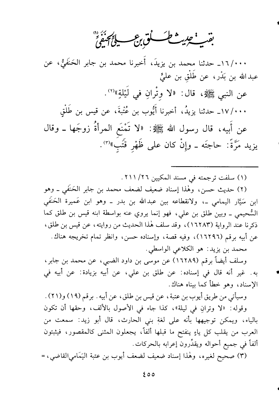 . . . / ١٦ - حَدَّثَنَا مُحَمَّدُ بْنُ يَزِيدَ، أَخْبَرَنَا مُحَمَّدُ بْنُ جَابِرٍ الْحَنَفِيِّ، عَنْ عَبْدِ اللهِ بْنِ بَدْرٍ، عَنْ طَلَّقِ بْنِ عَلِيٍّ، عَنِ النَّبِيِّ صَلَّى اللهُ عَلَيْهِ وَسَلَّمَ، قَالَ: " لَا وِتْرَانِ فِي لَيْلَةٍ " (٢)