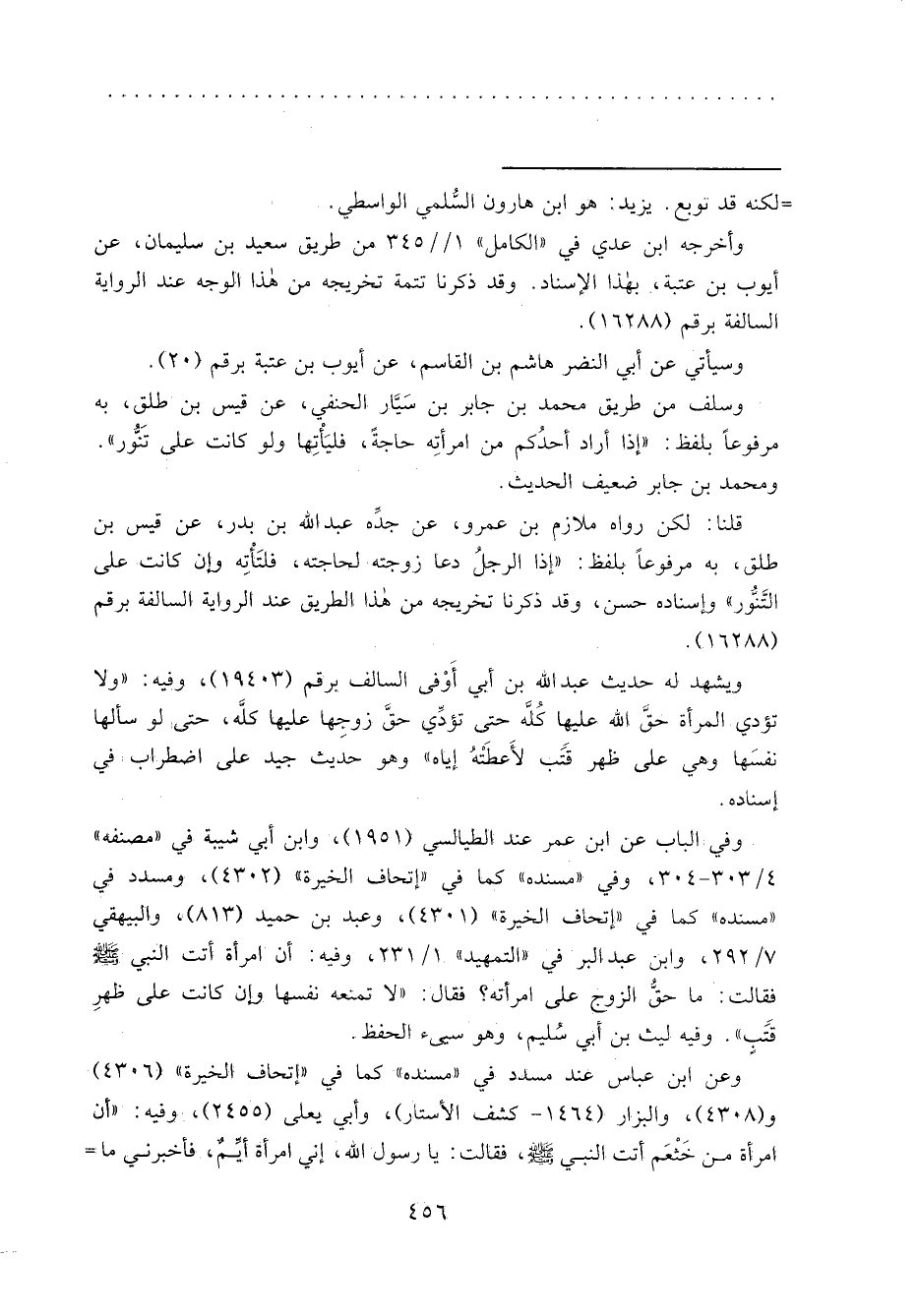 قلنا: لكن رواه ملازم بن عمرو، عن جدِّه عبد الله بن بدر، عن قيس بن طلق، به مرفوعاً بلفظ: "إذا الرجلُ دعا زوجته لحاجته، فلتَأْتِه وإن كانت على التَّنّوُر" وإسناده حسن، وقد ذكرنا تخريجه من هذا الطريق عند الرواية السالفة برقم (١٦٢٨٨) .