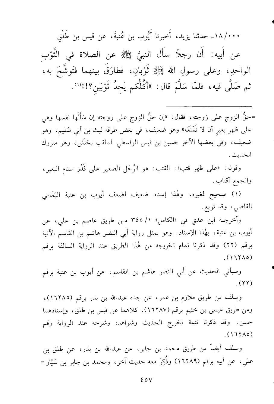 . . / ١٨ - حَدَّثَنَا يَزِيدُ، أَخْبَرَنَا أَيُّوبُ بْنُ عُتْبَةَ عَنْ قَيْس بْن طَلْقٍ، عَنْ أَبِيهِ: أَنَّ رَجُلًا سَأَلَ النَّبِيَّ صَلَّى اللهُ عَلَيْهِ وَسَلَّمَ عَنِ الصَّلَاةِ فِي الثَّوْبِ الْوَاحِدِ، وَعَلَى رَسُولِ اللهِ صَلَّى اللهُ عَلَيْهِ وَسَلَّمَ ثَوْبَانِ، فَطَارَقَ بَيْنَهُمَا فَتَوَشَّحَ بِهِ، ثُمَّ صَلَّى فِيهِ، فَلَمَّا سَلَّمَ قَالَ: " أَكُلُّكُمْ يَجِدُ ثَوْبَيْنِ؟ " (١)
