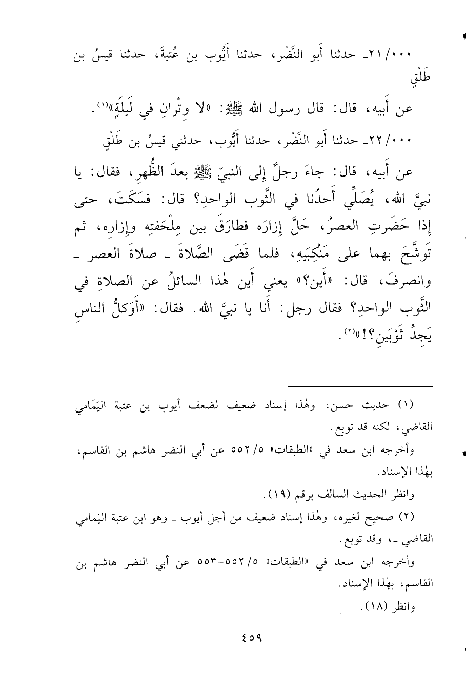 . . . / ٢٢ - حَدَّثَنَا أَبُو النَّضْرِ، حَدَّثَنَا أَيُّوبُ، حَدَّثَنِي قَيْسُ بْنُ طَلْقٍ، عَنْ أَبِيهِ قَالَ: جَاءَ رَجُلٌ إِلَى النَّبِيِّ صَلَّى اللهُ عَلَيْهِ وَسَلَّمَ بَعْدَ الظُّهْرِ، فَقَالَ: يَا نَبِيَّ اللهِ، يُصَلِّي أَحَدُنَا فِي الثَّوْبِ الْوَاحِدِ؟ قَالَ: فَسَكَتَ، حَتَّى إِذَا حَضَرَ الْعَصْرُ، حَلَّ إِزَارَهُ فَطَارَقَ بَيْنَ مِلْحَفَتِهِ وَإِزَارِهِ، ثُمَّ تَوَشَّحَ بِهِمَا عَلَى مَنْكِبَيْهِ، فَلَمَّا قَضَى الصَّلَاةَ - صَلَاةَ الْعَصْرِ - وَانْصَرَفَ، قَالَ: " أَيْنَ؟ " يَعْنِي أَيْنَ هَذَا السَّائِلُ عَنِ الصَّلَاةِ فِي الثَّوْبِ الْوَاحِدِ؟ فَقَالَ رَجُلٌ: أَنَا يَا نَبِيَّ اللهِ. فَقَالَ: " أَوَكُلُّ النَّاسِ يَجِدُ ثَوْبَيْنِ؟ " (٢)