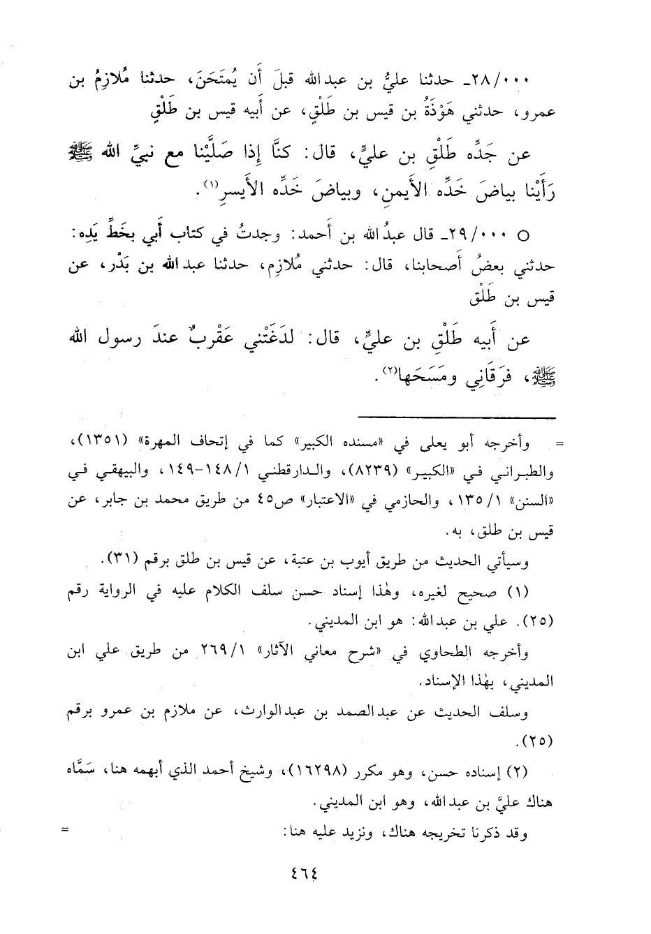 . . / ٢٨ - حَدَّثَنَا عَلِيُّ بْنُ عَبْدِ اللهِ قَبْلَ أَنْ يُمْتَحَنَ، حَدَّثَنَا مُلَازِمُ بْنُ عَمْرٍو، حَدَّثَنِي هَوْذَةُ بْنُ قَيْسِ بْنِ طَلْقٍ، عَنْ أَبِيهِ قَيْسِ بْنِ طَلْقٍ، عَنْ جَدِّهِ طَلَّقِ بْنِ عَلِيٍّ، قَالَ: كُنَّا إِذَا صَلَّيْنَا مَعَ نَبِيِّ اللهِ صَلَّى اللهُ عَلَيْهِ وَسَلَّمَ رَأَيْنَا بَيَاضَ خَدِّهِ الْأَيْمَنِ، وَبَيَاضَ خَدِّهِ الْأَيْسَرِ " (١)