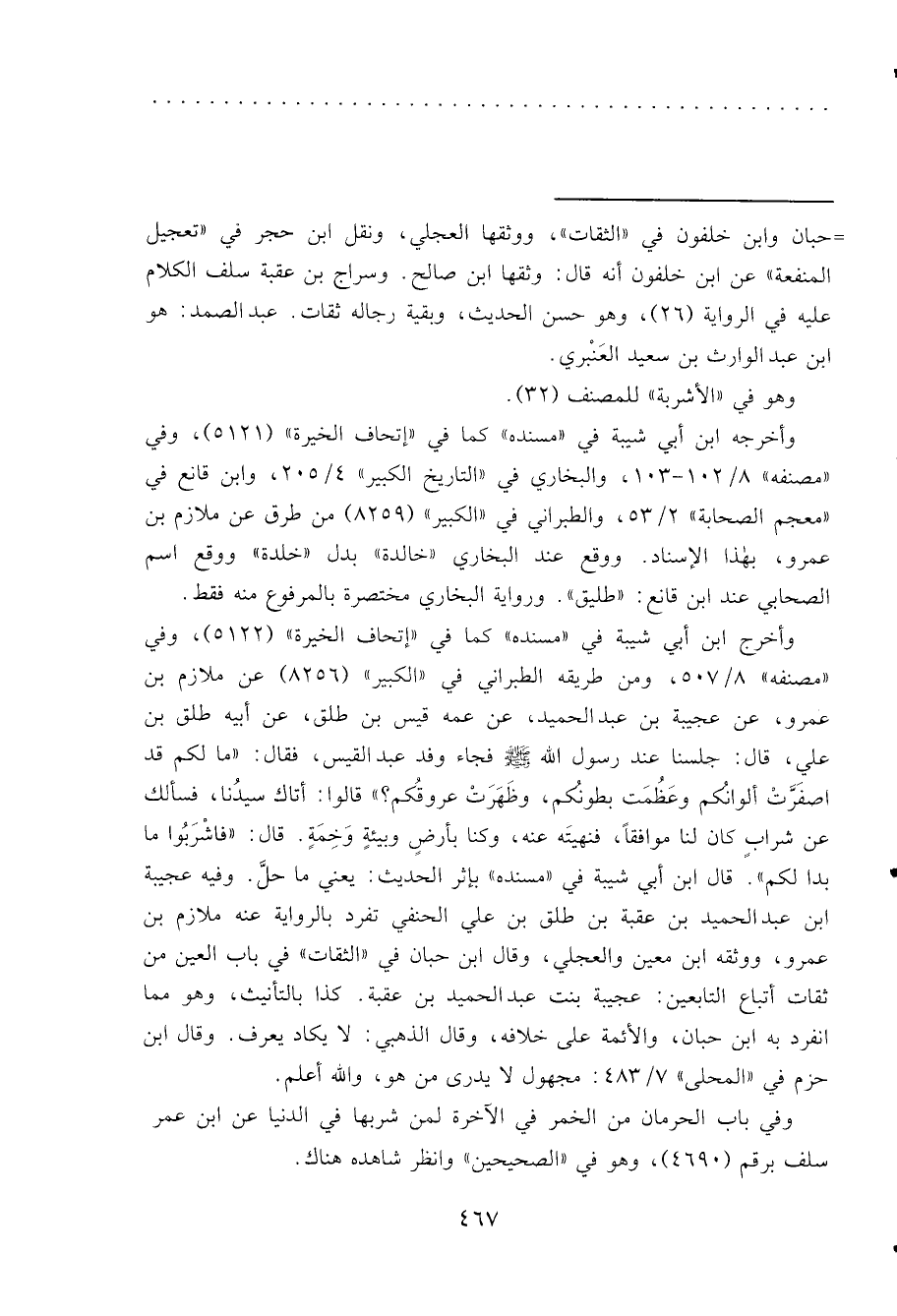 وأخرج ابن أبي شيبة في "مسنده" كما في "إتحاف الخيرة" (٥١٢٢) ، وفي "مصنفه" ٨/٥٠٧، ومن طريقه الطبراني في "الكبير" (٨٢٥٦) عن ملازم بن عمرو، عن عجيبة بن عبد الحميد، عن عمه قيس بن طلق، عن أبيه طلق بن علي، قال: جلسنا عند رسول الله صَلَّى اللهُ عَلَيْهِ وَسَلَّمَ فجاء وفد عبد القيس، فقال: "ما لكم قد اصفَرَّت ألوانُكم وعَظُمَت بطونُكم، وظَهَرَتْ عروقُكم؟ " قالوا: أتاك سيدُنا، فسألك عن شرابٍ كان لنا موافقاً، فنهيتَه عنه، وكنا بأرضٍ وبيئةٍ وَخِمَةٍ. قال: "فاشْرَبُوا ما بدا لكم". قال ابن أبي شيبة في "مسنده" بإثر الحديث: يعني ما حلَّ. وفيه عجيبة ابن عبد الحميد بن عقبة بن طلق بن علي الحنفي تفرد بالرواية عنه ملازم بن عمرو، ووثقه ابن معين والعجلي، وقال ابن حبان في "الثقات" في باب العين من ثقات أتباع التابعين: عجيبة بنت عبد الحميد بن عقبة. كذا بالتأنيث، وهو مما انفرد به ابن حبان، والأئمة على خلافه، وقال الذهبي: لا يكاد يعرف. وقال ابن حزم في "المحلى" ٧/٤٨٣: مجهول لا يدرى من هو، والله أعلم.