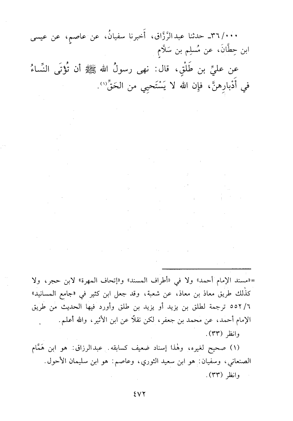 . . / ٣٦ - حَدَّثَنَا عَبْدُ الرَّزَّاقِ، أَخْبَرَنَا سُفْيَانُ، عَنْ عَاصِمٍ، عَنْ عِيسَى بْنِ حِطَّانَ، عَنْ مُسْلِمِ بْنِ سَلَّامٍ، عَنْ عَلِيِّ بْنِ طَلْقٍ، قَالَ: نَهَى رَسُولُ اللهِ صَلَّى اللهُ عَلَيْهِ وَسَلَّمَ أَنْ تُؤْتِى النِّسَاءُ فِي أَدْبَارِهِنَّ، فَإِنَّ اللهَ لَا يَسْتَحِي مِنَ الْحَقِّ " (١)
