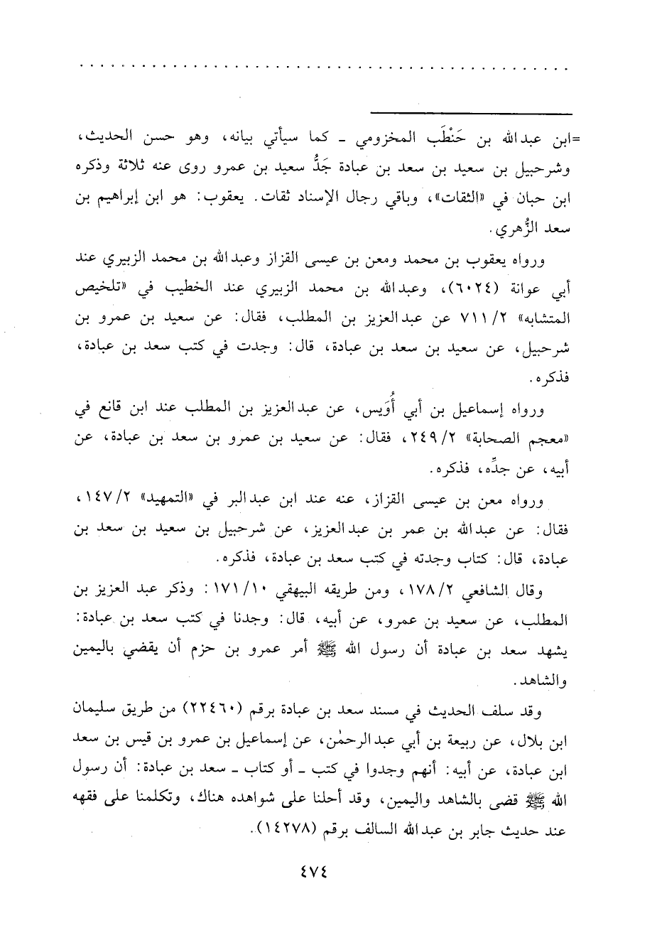 وقال الشافعي ٢/١٧٨، ومن طريقه البيهقي ١٠/١٧١: وذكر عبد العزيز بن المطلب، عن سعيد بن عمرو، عن أبيه، قال: وجدنا في كتب سعد بن عبادة: يشهد سعد بن عبادة أن رسول الله صَلَّى اللهُ عَلَيْهِ وَسَلَّمَ أمر عمرو بن حزم أن يقضي باليمين والشاهد.