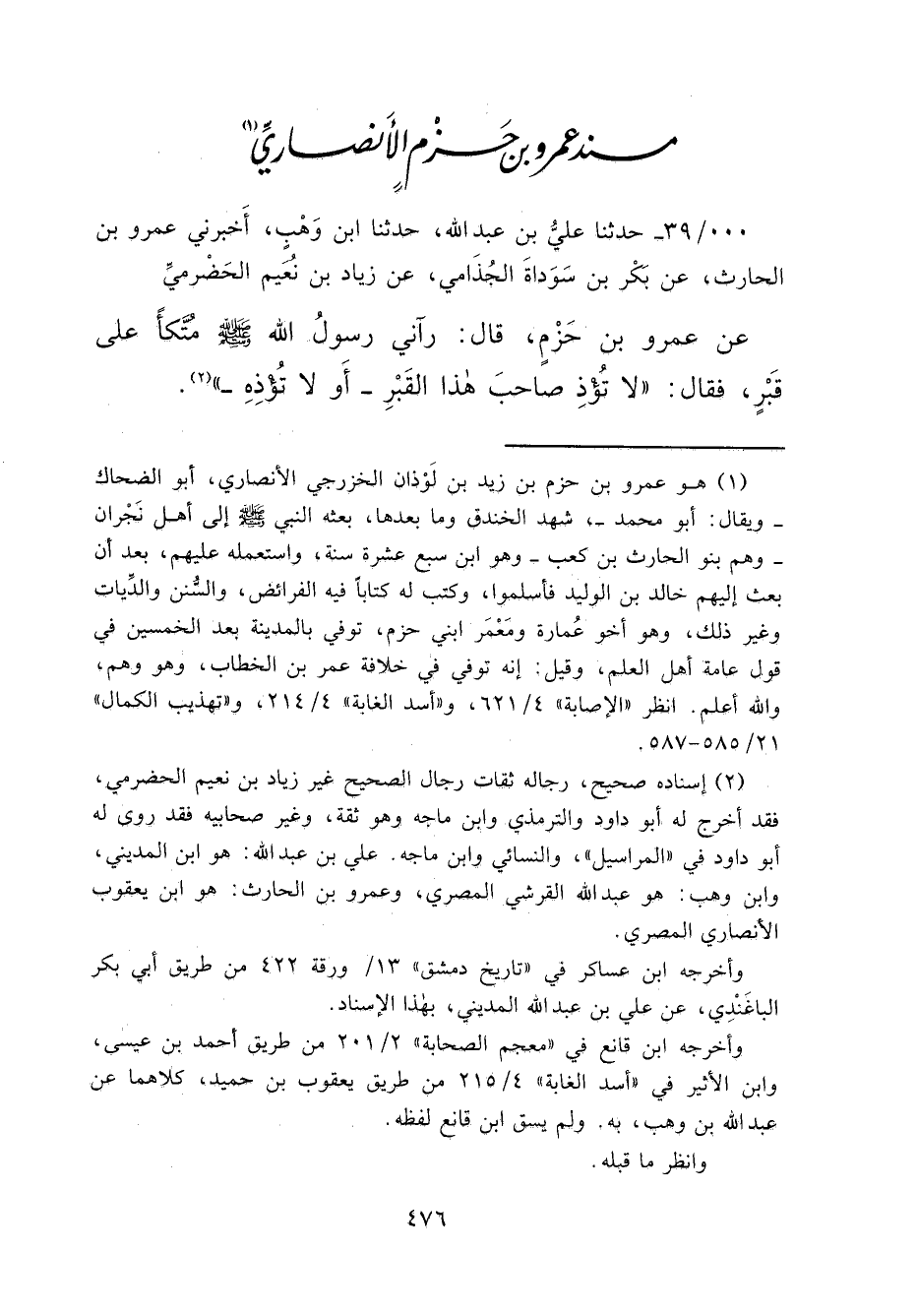 . . . / ٣٩ - حَدَّثَنَا عَلِيُّ بْنُ عَبْدِ اللهِ، حَدَّثَنَا ابْنُ وَهْبٍ، أَخْبَرَنِي عَمْرُو بْنُ الْحَارِثِ، عَنْ بَكْرِ بْنِ سُوَدَاةَ الْجُذَامِيِّ، عَنْ زِيَادِ بْنِ نُعَيْمٍ الْحَضْرَمِيِّ، عَنْ عَمْرِو بْنِ حَزْمٍ، قَالَ: رَآنِي رَسُولُ اللهِ صَلَّى اللهُ عَلَيْهِ وَسَلَّمَ مُتَّكَأً عَلَى قَبْرٍ، فَقَالَ: " لَا تُؤْذِ صَاحِبَ هَذَا الْقَبْرِ - أَوْ لَا تُؤْذِهِ - " (٢)