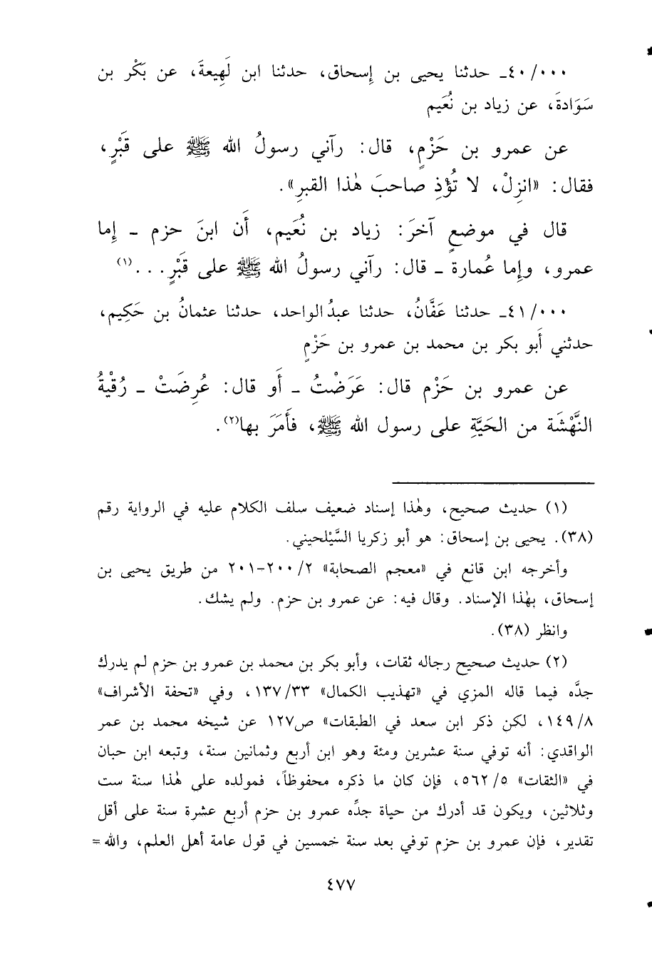 . . / ٤٠ - حَدَّثَنَا يَحْيَى بْنُ إِسْحَاقَ، حَدَّثَنَا ابْنُ لَهِيعَةَ، عَنْ بَكْرِ بْنِ سَوَادَةَ، عَنْ زِيَادِ بْنِ نُعَيْمٍ، عَنْ عَمْرِو بْنِ حَزْمٍ، قَالَ: رَآنِي رَسُولُ اللهِ صَلَّى اللهُ عَلَيْهِ وَسَلَّمَ عَلَى قَبْرٍ، فَقَالَ: " انْزِلْ، لَا تُؤْذِ صَاحِبَ هَذَا الْقَبْرِ "، قَالَ فِي مَوْضِعٍ آخَرَ زِيَادُ بْنُ نُعَيْمٍ، أَنَّ ابْنَ حَزْمٍ - إِمَّا عَمْرٌو، وَإِمَّا عُمَارَةُ - قَالَ: رَآنِي رَسُولُ اللهِ صَلَّى اللهُ عَلَيْهِ وَسَلَّمَ عَلَى قَبْرٍ. . . (١)