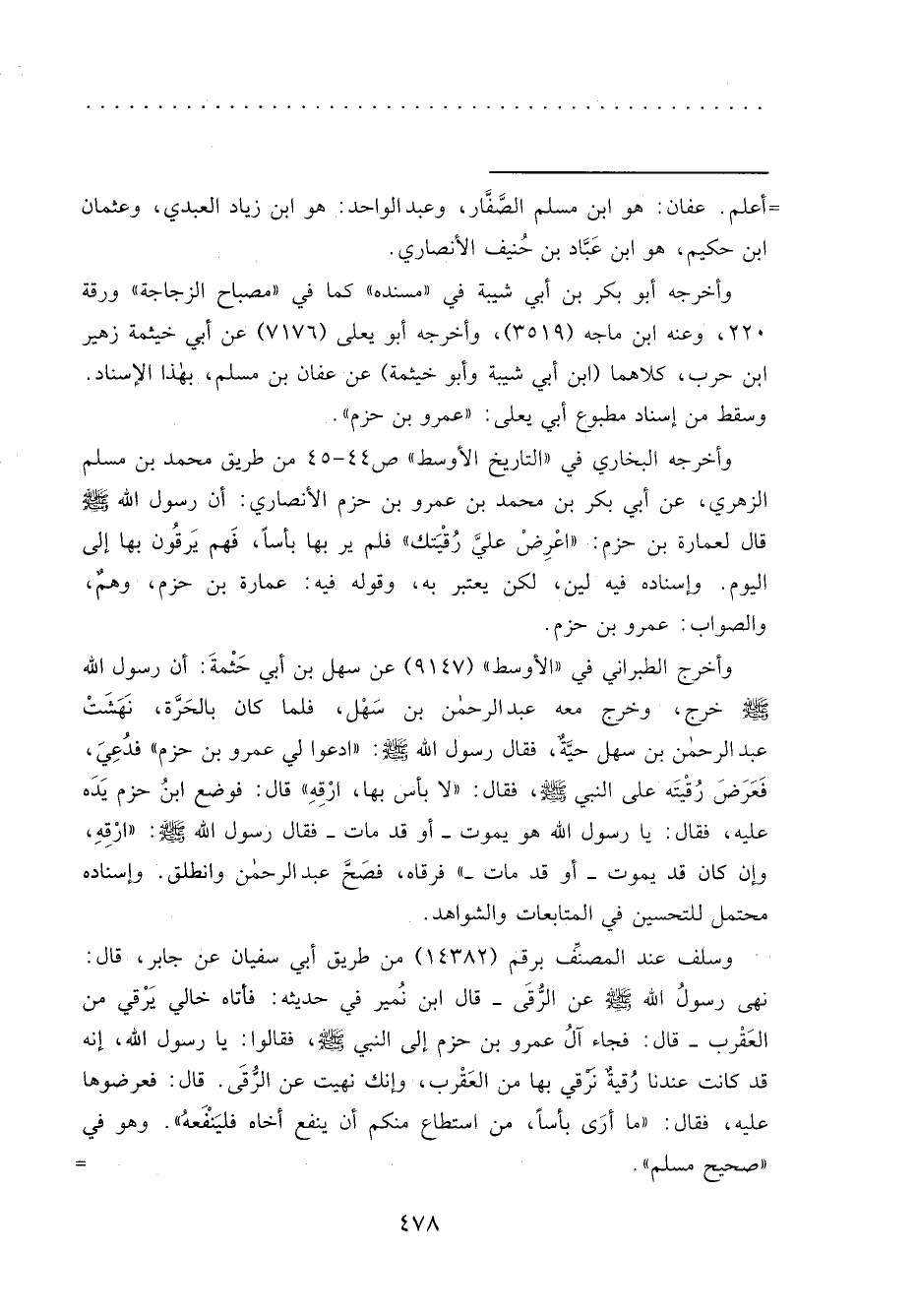 وأخرجه البخاري في "التاريخ الأوسط" ص٤٤-٤٥ من طريق محمد بن مسلم الزهري، عن أبي بكر بن محمد بن عمرو بن حزم الأنصاري: أن رسول الله صَلَّى اللهُ عَلَيْهِ وَسَلَّمَ قال لعمارة بن حزم: "اعْرِضْ عليَّ رُقْيَتك" فلم ير بها بأساً، فَهم يَرقُون بها إلى اليوم. وإسناده فيه لين، لكن يعتبر به، وقوله فيه: عمارة بن حزم، وهمٌ، والصواب: عمرو بن حزم.