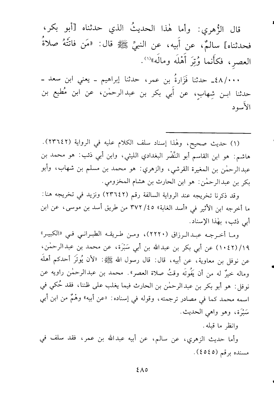 قَالَ الزُّهْرِيُّ: وَأَمَّا هَذَا الْحَدِيثُ الَّذِي حَدَّثَنَاهُ [أَبُو بَكْرٍ، فَحَدَّثَنَاهُ] سَالِمٌ، عَنْ أَبِيهِ، عَنِ النَّبِيِّ صَلَّى اللهُ عَلَيْهِ وَسَلَّمَ قَالَ: " مَنْ فَاتَتْهُ صَلَاةُ الْعَصْرِ، فَكَأَنَّمَا وُتِرَ أَهْلُهُ وَمَالُهُ " (١)