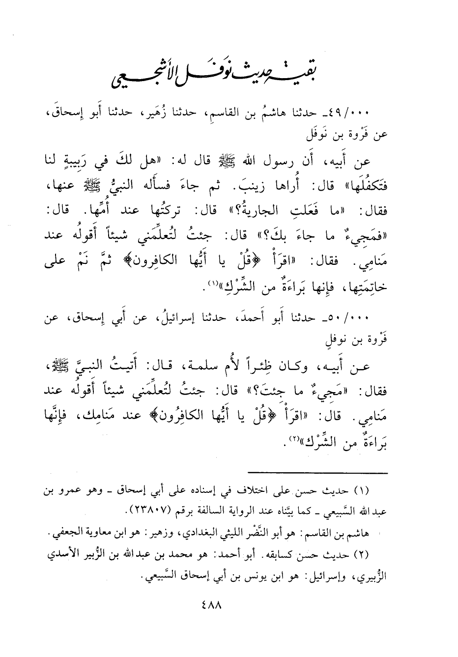 . . . / ٤٩ - حَدَّثَنَا هَاشِمُ بْنُ الْقَاسِمِ، حَدَّثَنَا زُهَيْرٌ، حَدَّثَنَا أَبُو إِسْحَاقَ، عَنْ فَرْوَةَ بْنِ نَوْفَلٍ، عَنْ أَبِيهِ: أَنَّ رَسُولَ اللهِ صَلَّى اللهُ عَلَيْهِ وَسَلَّمَ قَالَ لَهُ: " هَلْ لَكَ فِي رَبِيبَةٍ لَنَا فَتَكْفُلُهَا " قَالَ: أُرَاهَا زَيْنَبُ. ثُمَّ جَاءَ فَسَأَلَهُ النَّبِيُّ صَلَّى اللهُ عَلَيْهِ وَسَلَّمَ عَنْهَا، فَقَالَ: " مَا فَعَلْتِ الْجَارِيَةُ؟ " قَالَ: تَرَكْتُهَا عِنْدَ أُمِّهَا. قَالَ: " فَمَجِيءُ مَا جَاءَ بِكَ؟ " قَالَ: جِئْتُ لِتُعَلِّمَنِي شَيْئًا أَقُولُهُ عِنْدَ مَنَامِي. فَقَالَ: اقْرَأْ قُلْ يَا أَيُّهَا الْكَافِرُونَ ثُمََّ نَمْ عَلَى خَاتِمَتِهَا، فَإِنَّهَا بَرَاءَةٌ مِنَ الشِّرْكِ " (١)