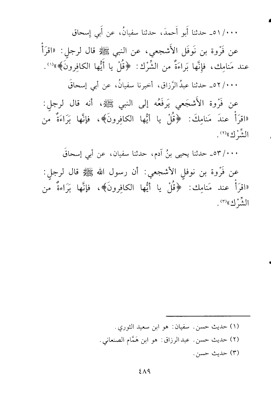 . . . / ٥٣ - حَدَّثَنَا يَحْيَى بْنُ آدَمَ، حَدَّثَنَا سُفْيَانُ، عَنْ أَبِي إِسْحَاقَ، عَنْ فَرْوَةَ بْنِ نَوْفَلٍ الْأَشْجَعِيِّ: أَنَّ رَسُولَ اللهٍِ صَلَّى اللهُ عَلَيْهِ وَسَلَّمَ قَالَ لِرَجُلٍ: " اقْرَأْ عِنْدَ مَنَامِكَ: {قُلْ يَا أَيُّهَا الْكَافِرُونَ} ، فَإِنَّهَا بَرَاءَةٌ مِنَ الشِّرْكِ " (٣)