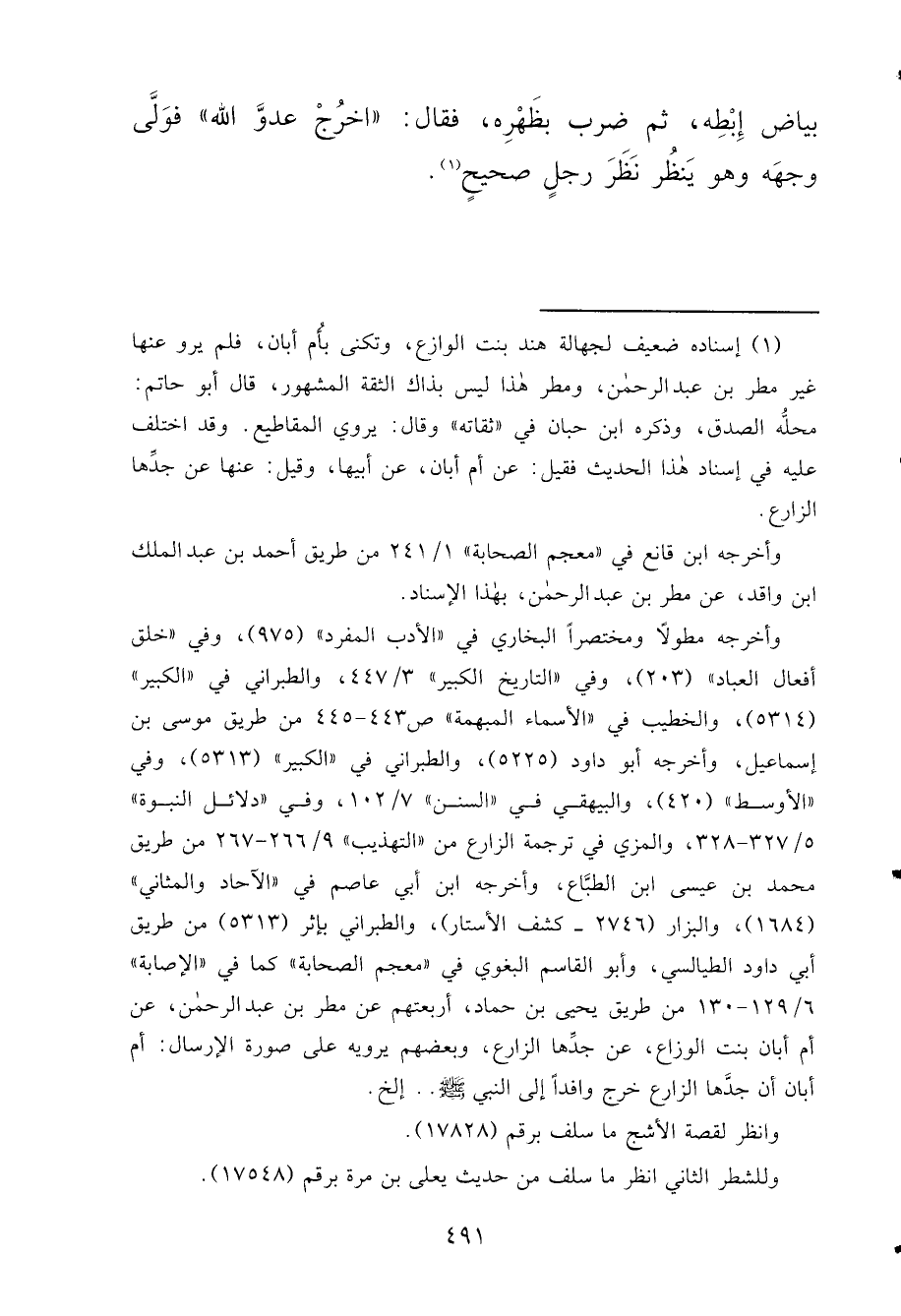 أم أبان بنت الوزاع، عن جدِّها الزارع، وبعضهم يرويه على صورة الإرسال: أم أبان أن جدَّها الزارع خرج وافداً إلى النبي صَلَّى اللهُ عَلَيْهِ وَسَلَّمَ.. إلخ.