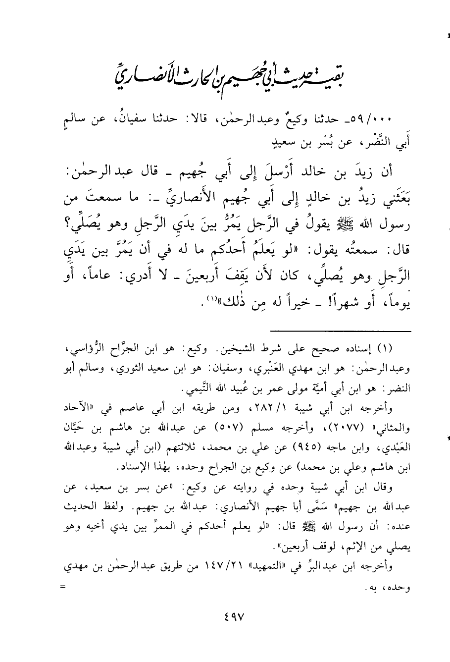 . . . / ٥٩ - حَدَّثَنَا وَكِيعٌ، وَعَبْدُ الرَّحْمَنِ قَالَا: حَدَّثَنَا سُفْيَانُ، عَنْ سَالِمٍ أَبِي النَّضْرِ، عَنْ بُسْرِ بْنِ سَعِيدٍ. أَنَّ زَيْدَ بْنَ خَالِدٍ أَرْسَلَ إِلَى أَبِي جُهَيْمٍ - قَالَ عَبْدُ الرَّحْمَنِ: بَعَثَنِي زَيْدُ بْنُ خَالِدٍ إِلَى أَبِي جُهَيْمِ الْأَنْصَارِيِّ: مَا سَمِعْتَ مِنْ رَسُولِ اللهِ صَلَّى اللهُ عَلَيْهِ وَسَلَّمَ يَقُولُ فِي الرَّجُلِ يَمُرُّ بَيْنَ يَدَيِ الرَّجُلِ وَهُوَ يُصَلِّي؟ قَالَ: سَمِعْتُهُ يَقُولُ: " لَوْ يَعْلَمُ أَحَدُكُمْ مَا لَهُ فِي أَنْ يَمُرَّ بَيْنَ يَدَيِ الرَّجُلِ وَهُوَ يُصَلِّي، كَانَ لِأَنْ يَقِفَ أَرْبَعِينَ - لَا أَدْرِي: عَامًا، أَوْ يَوْمًا، أَوْ شَهْرًا - خَيْرًا لَهُ مِنْ ذَلِكَ " (١)