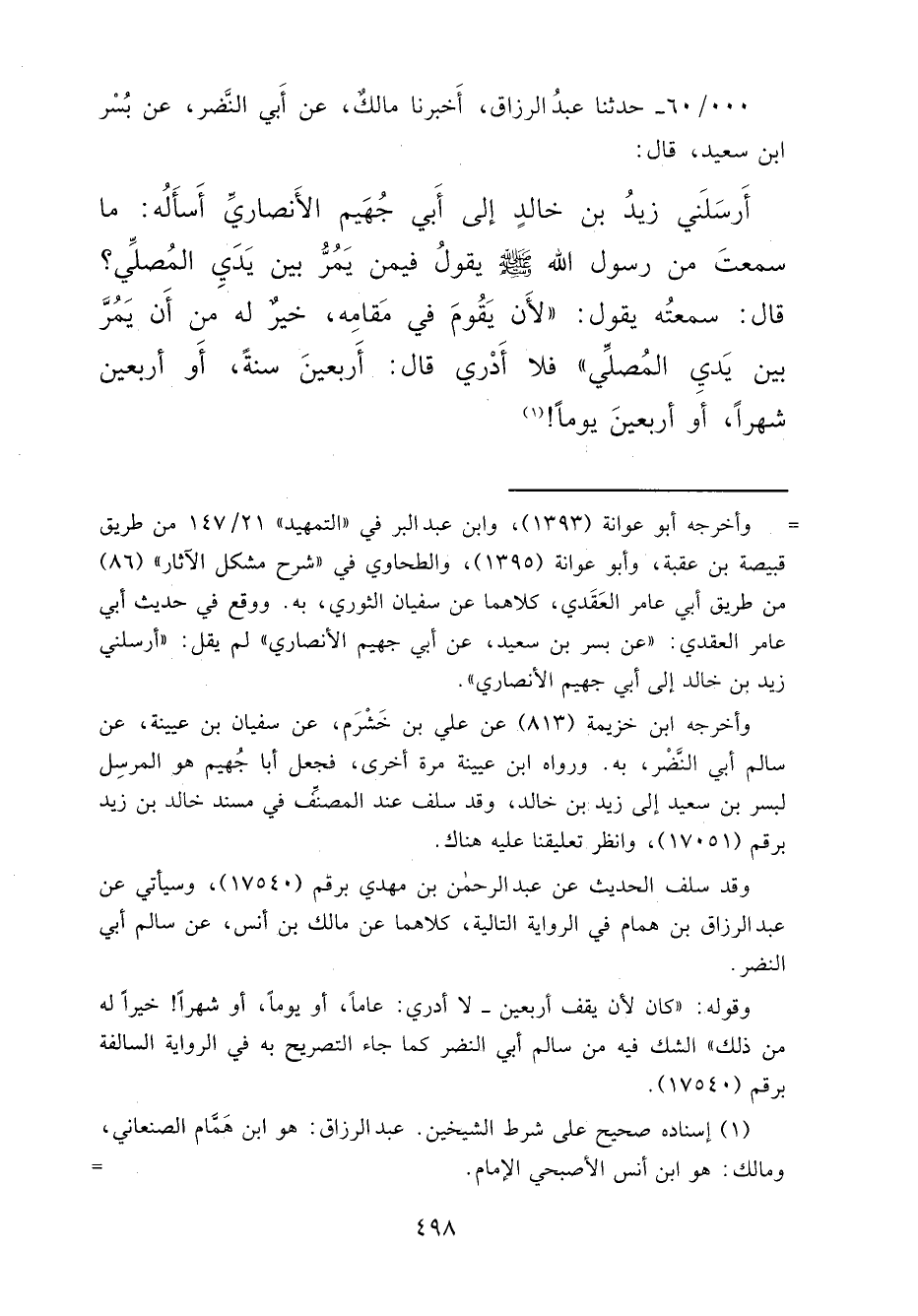 . . / ٦٠ - حَدَّثَنَا عَبْدُ الرَّزَّاقِ، أَخْبَرَنَا مَالِكٌ، عَنْ أَبِي النَّضْرِ، عَنْ بُسْرِ بْنِ سَعِيدٍ، قَالَ: أَرْسَلَنِي زَيْدُ بْنُ خَالِدٍ إِلَى أَبِي جُهَيْمٍ الْأَنْصَارِيِّ أَسْأَلُهُ: مَا سَمِعْتَ مِنْ رَسُولِ اللهِ صَلَّى اللهُ عَلَيْهِ وَسَلَّمَ يَقُولُ فِيمَنْ يَمُرُّ بَيْنَ يَدَيِ الْمُصَلِّي؟ قَالَ: سَمِعْتُهُ يَقُولُ: " لِأَنْ يَقُومَ فِي مَقَامِهِ، خَيْرٌ لَهُ مِنْ أَنْ يَمُرَّ بَيْنَ يَدَيِ الْمُصَلِّي " فَلَا أَدْرِي قَالَ: أَرْبَعِينَ سَنَةً، أَوْ أَرْبَعِينَ شَهْرًا، أَوْ أَرْبَعِينَ يَوْمًا (١)