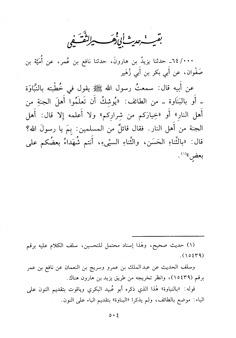 . . . / ٦٤ - حَدَّثَنَا يَزِيدُ بْنُ هَارُونَ، حَدَّثَنَا نَافِعُ بْنُ عُمَرَ، عَنْ أُمَيَّةَ بْنِ صَفْوَانَ، عَنْ أَبِي بَكْرِ بْنِ أَبِي زُهَيْرٍ، عَنْ أَبِيهِ قَالَ: سَمِعْتُ رَسُولَ اللهِ صَلَّى اللهُ عَلَيْهِ وَسَلَّمَ يَقُولُ فِي خُطْبَتِهِ بِالنَّبَاوَةِ - أَوْ بِالْبَنَاوَةِ - مِنَ الطَّائِفِ: " يُوشِكُ أَنْ تَعَلَمُوا أَهْلَ الْجَنَّةِِ مِنْ أَهْلْ النَّارِ " أَوْ " خِيَارُكُمْ مِنْ شِرَارُكُمْ " وَلَا أَعْلَمُهُ إِلَّا قَالَ: " أَهْلَ الْجَنَّةِ مِنْ أَهْلِ النَّارْ ". فَقَالَ قَائِلٌ مِنَ الْمُسْلِمِينَ: بِمَ يَا رَسُولَ اللهِ؟ قَالَ: " بِالثَّنَاءِ الْحَسَنِ، وَالثَّنَاءِ السَّيِّئِ، أَنْتُمْ شُهَدَاءُ بَعْضِكُمْ عَلَى بَعْضٍ " (١)