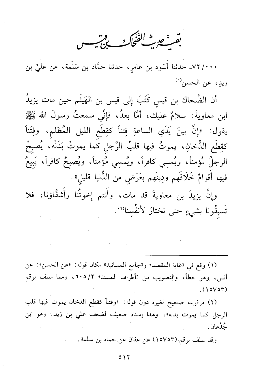 . . . / ٧٢ - حَدَّثَنَا أَسْوَدُ بْنُ عَامِرٍ، حَدَّثَنَا حَمَّادُ بْنُ سَلَمَةَ، عَنْ عَلِيِّ بْنِ زَيْدٍ، عَنِ الْحَسَنِ (١) : أَنَّ الضَّحَّاكَ بْنَ قَيْسٍ كَتَبَ إِلَى قَيْسِ بْنِ الْهَيْثَمِ حِينَ مَاتَ يَزِيدُ بْنُ مُعَاوِيَةَ: سَلَامٌ عَلَيْكَ، أَمَّا بَعْدُ، فَإِنِّي سَمِعْتُ رَسُولَ اللهِ صَلَّى اللهُ عَلَيْهِ وَسَلَّمَ يَقُولُ: " إِنَّ بَيْنَ يَدَيِ السَّاعَةِ فِتَنًا كَقِطَعِ اللَّيْلِ الْمُظْلِمِ، وَفِتَنًا كَقِطَعِ الدُّخَانِ، يَمُوتُ فِيهَا قَلْبُ الرَّجُلِ كَمَا يَمُوتُ بَدَنُهُ، يُصْبِحُ الرَّجُلُ مُؤْمِنًا، وَيُمْسِي كَافِرًا، وَيُمْسِي مُؤْمِنًا، يُصْبِحُ كَافِرًا، يَبِيعُ فِيهَا أَقْوَامٌ خَلَاقَهُمْ وَدِينَهُمْ بِعَرَضٍ مِنَ الدُّنْيَا قَلِيلٍ ". وَإِنَّ يَزِيدَ بْنَ مُعَاوِيَةَ قَدْ مَاتَ، وَأَنْتُمْ إِخْوَتُنَا وَأَشِقَّاؤُنَا، فَلَا تَسْبِقُونَا بِشَيْءٍ حَتَّى نَخْتَارُ لِأَنْفُسِنَا (٢)