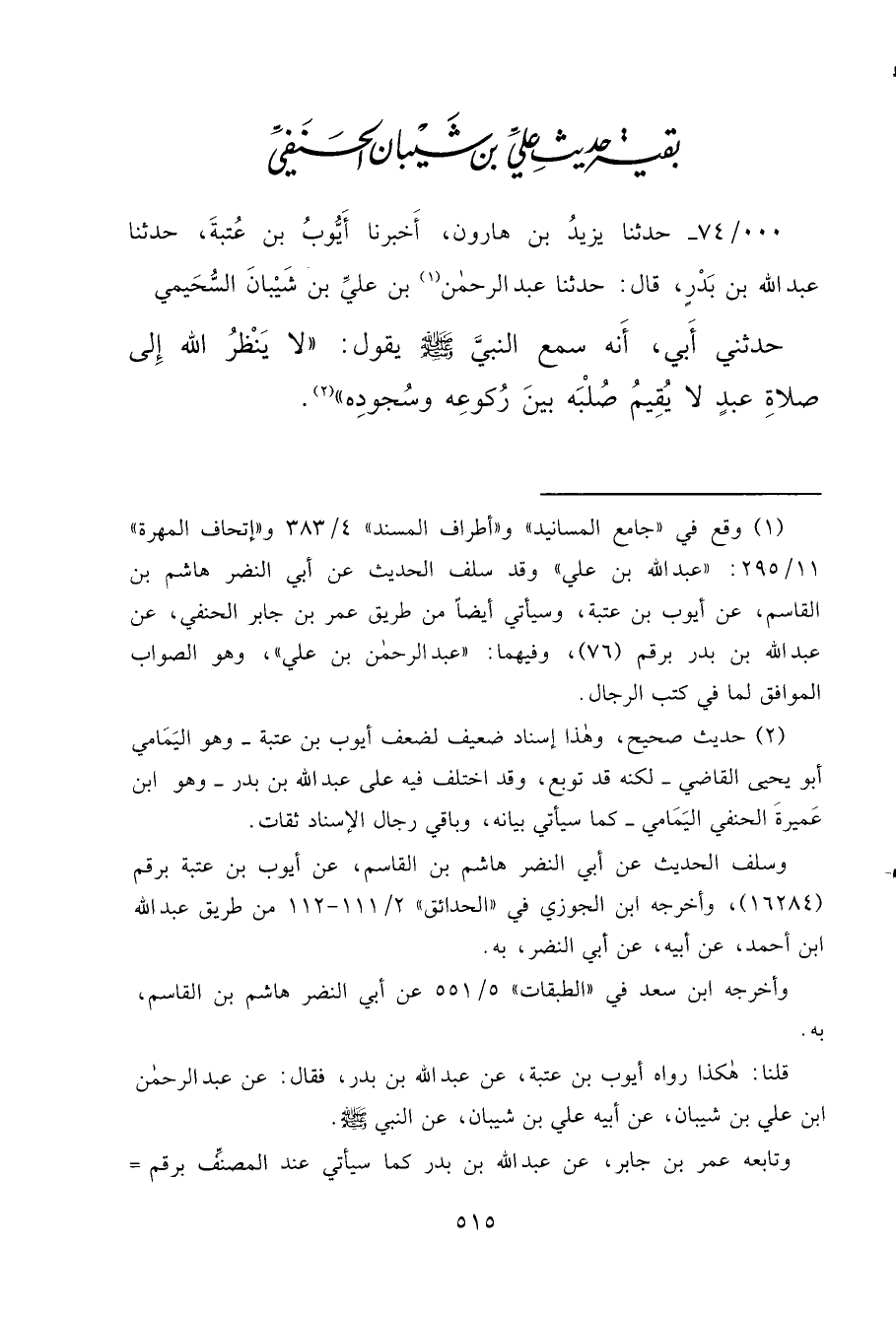 . . . / ٧٤ - حَدَّثَنَا يَزِيدُ بْنُ هَارُونَ، أَخْبَرَنَا أَيُّوبُ بْنُ عُتْبَةَ، حَدَّثَنَا عَبْدُ اللهِ بْنُ بَدْرٍ، قَالَ: حَدَّثَنَا عَبْدُ الرَّحْمَنِ (١) بْنُ عَلِيِّ بْنِ شَيْبَانَ السُّحَيْمِيُّ، حَدَّثَنِي أَبِي: أَنَّهُ سَمِعَ النَّبِيَّ صَلَّى اللهُ عَلَيْهِ وَسَلَّمَ يَقُولُ: " لَا يَنْظُرُ اللهُ إِلَى صَلَاةِ عَبْدٍ لَا يُقِيمُ صُلْبَهُ بَيْنَ رُكُوعِهِ وَسُجُودِهِ " (٢)