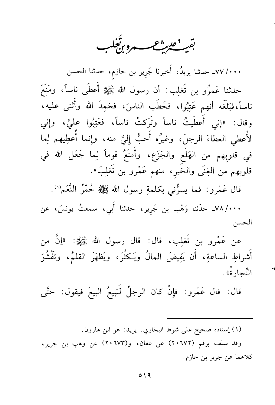 . . . / ٧٧ - حَدَّثَنَا يَزِيدُ، أَخْبَرَنَا جَرِيرُ بْنُ حَازِمٍ، حَدَّثَنَا حَسَنٌ، حَدَّثَنَا عَمْرُو بْنُ تَغْلِبَ: أَنَّ رَسُولَ اللهِ صَلَّى اللهُ عَلَيْهِ وَسَلَّمَ أَعْطَى ناسًا، وَمَنَع نَاسًا، فَبَلَغَهُ أَنَّهُمْ عَتَبُوا، فَخَطَبَ النَّاسَ، فَحَمِدَ اللهَ وَأَثْنَى عَلَيْهِ، وَقَالَ: " إِنِّي أَعْطَيْتُ نَاسًا، وَتَرَكْتُ نَاسًا، فَعَتَبُوا عَلِيَّ، وَإِنِّي لَأُعْطِي الْعَطَاءَ الرَّجُلًَ، وَغَيْرُهُ أَحَبُّ إِلَيَّ مِنْهُ، وَإِنَّمَا أُعْطِيهِمْ لِمَا فِي قُلُوبِهِمْ مِنَ الْهَلَعِ وَالْجَزَعِ، وَأَمْنَعُ قَوْمًا لِمَا جَعَلَ اللهُ فِي قُلُوبِهِمْ مِنَ الْغِنَى وَالْخَيْرِ، مِنْهُمْ عَمْرُو بْنُ تَغْلِبَ ". قَالَ عَمْرٌو: فَمَا يَسُرُّنِي بِكَلِمَةِ رَسُولِ اللهِ صَلَّى اللهُ عَلَيْهِ وَسَلَّمَ حُمْرُ النَّعَم (١)