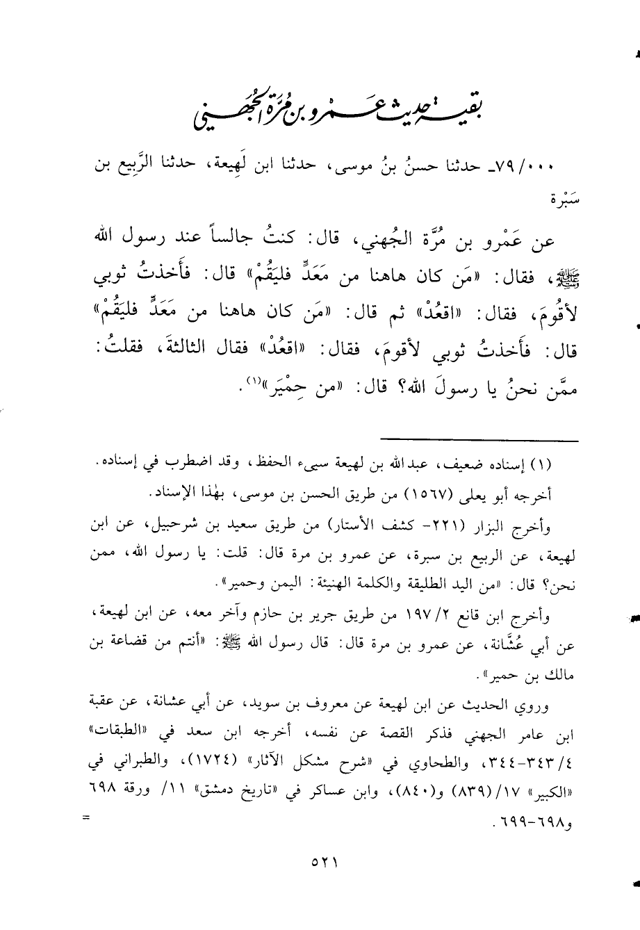 . . . / ٧٩ - حَدَّثَنَا حَسَنُ بْنُ مُوسَى، حَدَّثَنَا ابْنُ لَهِيعَةَ، حَدَّثَنَا الرَّبِيعُ بْنُ سَبْرَةَ، عَنْ عَمْرِو بْنُ مُرَّةَ الْجُهَنِيِّ، قَالَ: كُنْتُ جَالِسًا عِنْدَ رَسُولِ اللهِ صَلَّى اللهُ عَلَيْهِ وَسَلَّمَ، فَقَالَ: " مَنْ كَانَ هَاهُنَا مِنْ مَعْدٍ فَلْيَقُمْ " قَالَ: فَأَخَذْت ُثَوْبِي لَأَقُومَ، فَقَالَ: " اقْعُدْ " ثُمَّ قَالَ: " مِن كَانَ هَاهُنَا مِنْ مَعْدٍ فَلْيَقُمْ " قَالَ: فَأَخَذْتُ ثَوْبِي لَأَقُومَ، فَقَالَ: " اقْعُد " فَقَالَ الثَّالِثَةَ، فَقُلْتُ: مِمَّنْ نَحْنُ يَا رَسُولَ اللهِ؟ قَالَ: " مِنْ حِمْيَرَ " (١)