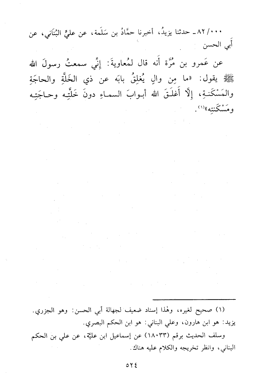 . . / ٨٢ - حَدَّثَنَا يَزِيدُ، أَخْبَرَنَا حَمَّادُ بْنُ سَلَمَةَ، عَنْ عَلِيٍّ الْبُنَانِيِّ، عَنْ أَبِي الْحَسَنِ، عَنْ عَمْرِو بْنِ مُرَّةَ أَنَّهُ قَالَ لِمُعَاوِيَةَ: إِنِّي سَمِعْتُ رَسُولَ اللهِ صَلَّى اللهُ عَلَيْهِ وَسَلَّمَ يَقُولُ: " مَا مِنْ وَالٍ يُغْلَقُ بَابَهُ عَنْ ذِي الْخَلَّةِ وَالْحَاجَةِ وَالْمَسْكَنَةِ، إِلَّا أَغْلَقَ اللهُ أَبْوَابَ السَّمَاءِ دُونَ خَلَّتِهِ وَحَاجَتِهِ وَمَسْكَنَتِهِ " (١)