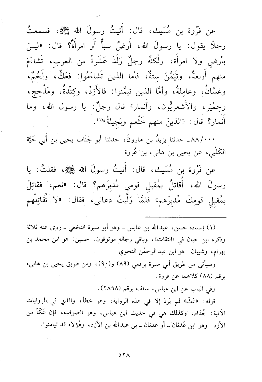 . . . / ٨٨ - حَدَّثَنَا يَزِيدُ بْنُ هَارُونَ، حَدَّثَنَا أَبُو جَنَابٍ يَحْيَى بْنُ أَبِي حَيَّةَ الْكَلْبِيُّ، عَنْ يَحْيَى بْنِ هَانِئِ بْنِ عُرْوَةَ، عَنْ فَرْوَةَ بْن ِمُسَيْكٍ، قَالَ: أَتَيْتُ رَسُولَ اللهِ صَلَّى اللهُ عَلَيْهِ وَسَلَّمَ، فَقُلْتُ: يَا رَسُولَ اللهِ، أُقَاتِلُ بِمُقْبِلِ قَوْمِي مُدْبِرَهُمْ؟ قَالَ: " نَعَمْ، فَقَاتَل بمقبل مدبرهم " فَلَمَّا وُلِّيت دَعَانِي، فَقَالَ: " لَا تُقَاتِلْهُم
