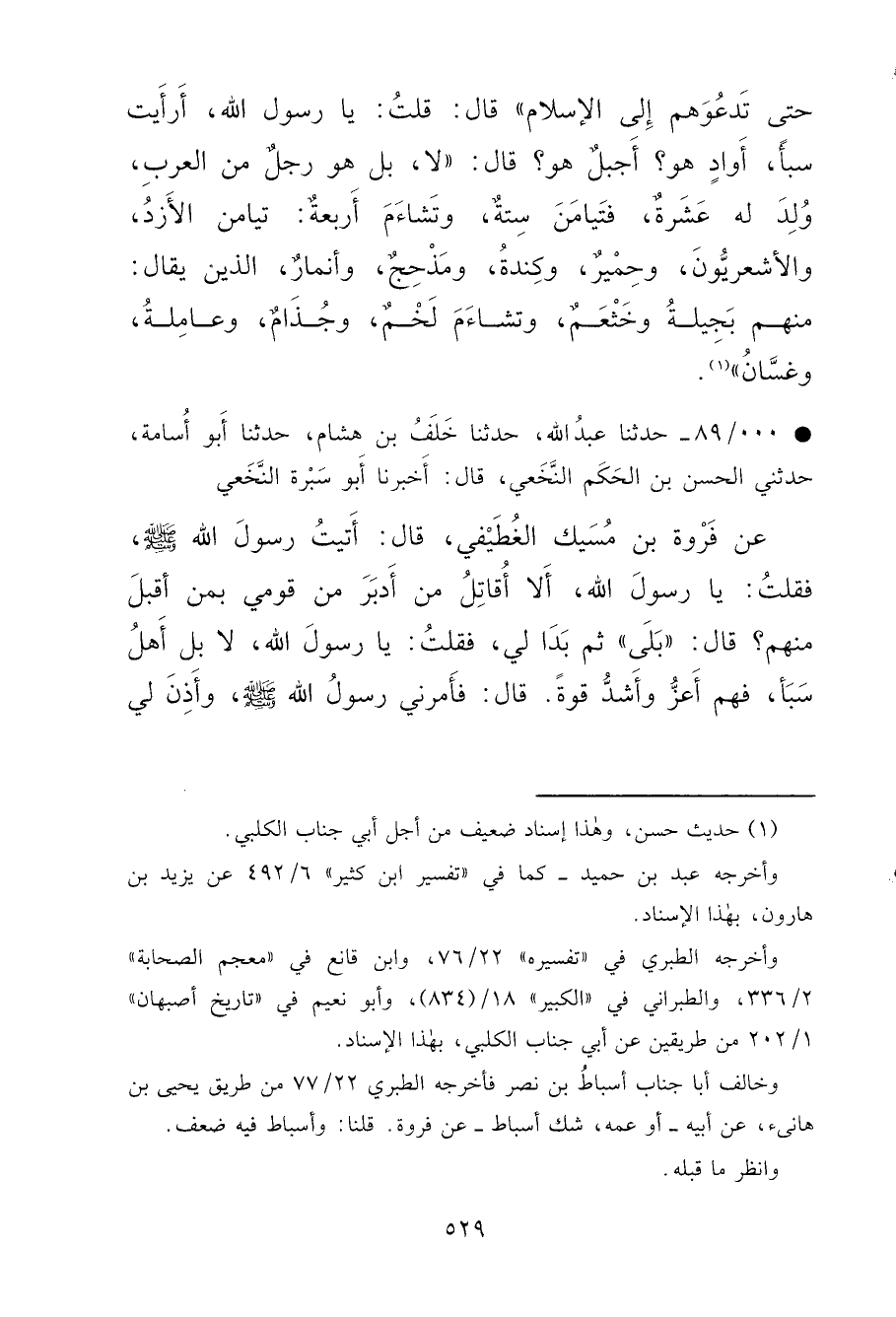 •. . . /٨٩ - حَدَّثَنَا عَبْدُ اللهِ، حَدَّثَنَا خَلَفُ بْنُ هِشَامٍ، حَدَّثَنَا أَبُو أُسَامَةَ، حَدَّثَنِي الْحَسَنُ بْنُ الْحَكَمِ النَّخَعِيُّ، قَالَ: أَخْبَرَنَا أَبُو سَبْرَةَ النَّخَعِيُّ، عَنْ فَرْوَةَ بْنِ مُسَيْكٍ الْغُطَيْفِيِّ، قَالَ: أَتَيْتُ رَسُولَ اللهِ صَلَّى اللهُ عَلَيْهِ وَسَلَّمَ، فَقُلْتُ، يَا رَسُولَ اللهِ، أَلَا أُقَاتِلُ مَنْ أَدْبَرَ مِنْ قَوْمِي بِمَنْ أَقْبَلَ مِنْهُمْ؟ قَالَ: " بَلَى " ثُمَّ بَدَا لِي، فَقُلْتُ: يَا رَسُولَ اللهِ، لَا بَلْ أَهْلَ سَبَأٍ، فَهُمْ أَعَزُّ وَأَشَدُّ قُوَّةً. قَالَ: فَأَمَرَنِي رَسُولُ اللهِ صَلَّى اللهُ عَلَيْهِ وَسَلَّمَ، وَأَذِنَ لِي