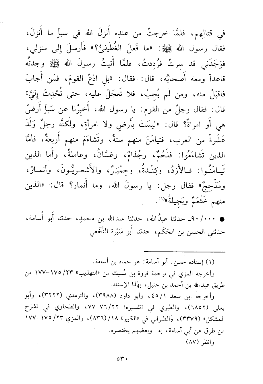 •. . . /٩٠ - حَدَّثَنَا عَبْدُ اللهِ، حَدَّثَنَا عَبْدُ الله ِبْنُ مُحَمَّدٍ، حَدَّثَنَا أَبُو أُسَامَةََ، حَدَّثَنِي الْحَسَنُ بْنُ الْحَكَمِ، حَدَّثَنَا أَبُو سَبْرَةَ النَّخَعِيُّ،