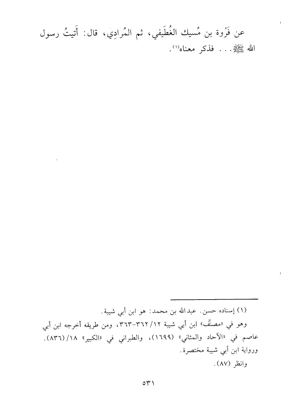 عَنْ فَرْوَةَ بْنِ مُسَيْكٍ الْغُطَيْفِيُّ ثُمَّ الْمُرَادِيُّ، قَالَ: أَتَيْتُ رَسُولَ اللهِ صَلَّى اللهُ عَلَيْهِ وَسَلَّمَ. . . فَذَكَرَ مَعْنَاهُ (١)