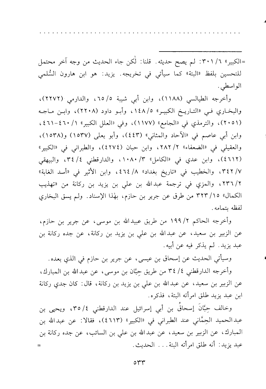 = الكبير" ٦/٣٠١: لم يصح حديثه. قلنا: لكن جاء الحديث من وجه آخر محتمل للتحسين بلفظ "البتة" كما سيأتي في تخريجه. يزيد: هو ابن هارون السُّلمي الواسطي.