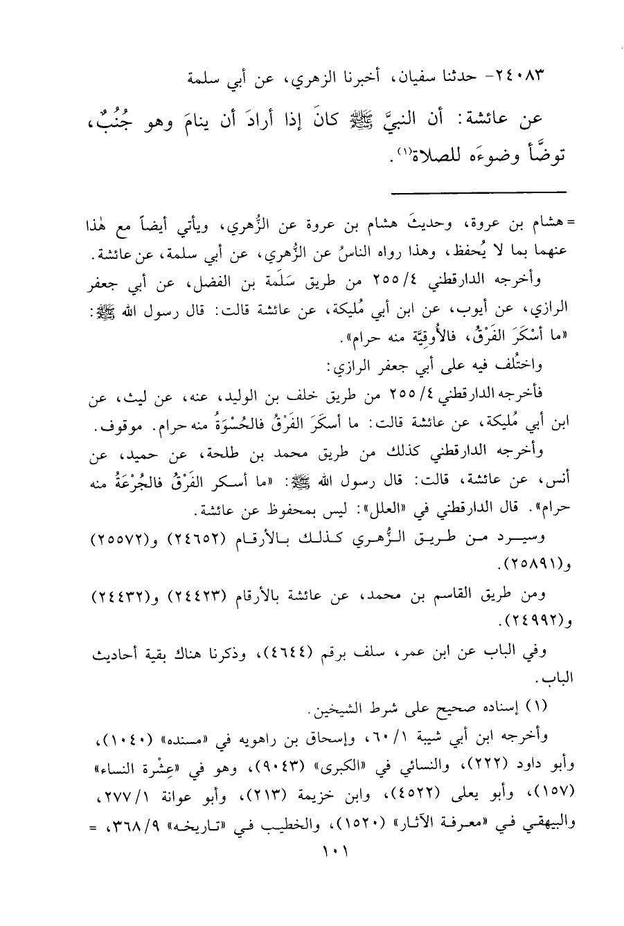 ٢٤٠٨٣ - حَدَّثَنَا سُفْيَانُ، أَخْبَرَنَا الزُّهْرِيُّ، عَنْ أَبِي سَلَمَةَ، عَنْ عَائِشَةَ، " أَنَّ النَّبِيَّ صَلَّى اللهُ عَلَيْهِ وَسَلَّمَ كَانَ إِذَا أَرَادَ أَنْ يَنَامَ وَهُوَ جُنُبٌ، تَوَضَّأَ وُضُوءَهُ لِلصَّلَاةِ " (١)