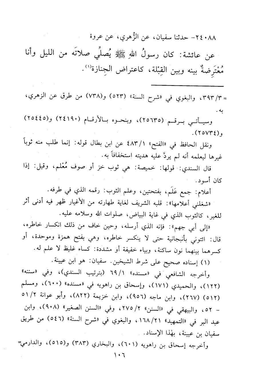 ٢٤٠٨٨ - حَدَّثَنَا سُفْيَانُ، عَنِ الزُّهْرِيِّ، عَنْ عُرْوَةَ، عَنْ عَائِشَةَ، " كَانَ رَسُولُ اللهِ صَلَّى اللهُ عَلَيْهِ وَسَلَّمَ يُصَلِّي صَلَاتَهُ مِنَ اللَّيْلِ، وَأَنَا مُعْتَرِضَةٌ بَيْنَهُ وَبَيْنَ الْقِبْلَةِ، كَاعْتِرَاضِ الْجِنَازَةِ " (١)