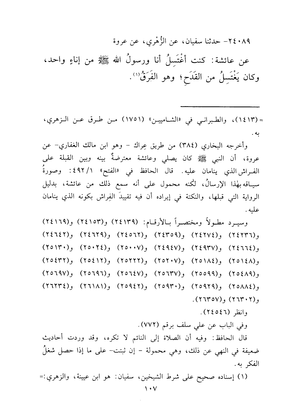 ٢٤٠٨٩ - حَدَّثَنَا سُفْيَانُ، عَنِ الزُّهْرِيِّ، عَنْ عُرْوَةَ، عَنْ عَائِشَةَ، " كُنْتُ أَغْتَسِلُ أَنَا وَرَسُولُ اللهِ صَلَّى اللهُ عَلَيْهِ وَسَلَّمَ مِنْ إِنَاءٍ وَاحِدٍ، وَكَانَ يَغْتَسِلُ مِنَ الْقَدَحِ وَهُوَ الْفَرَقُ " (١)