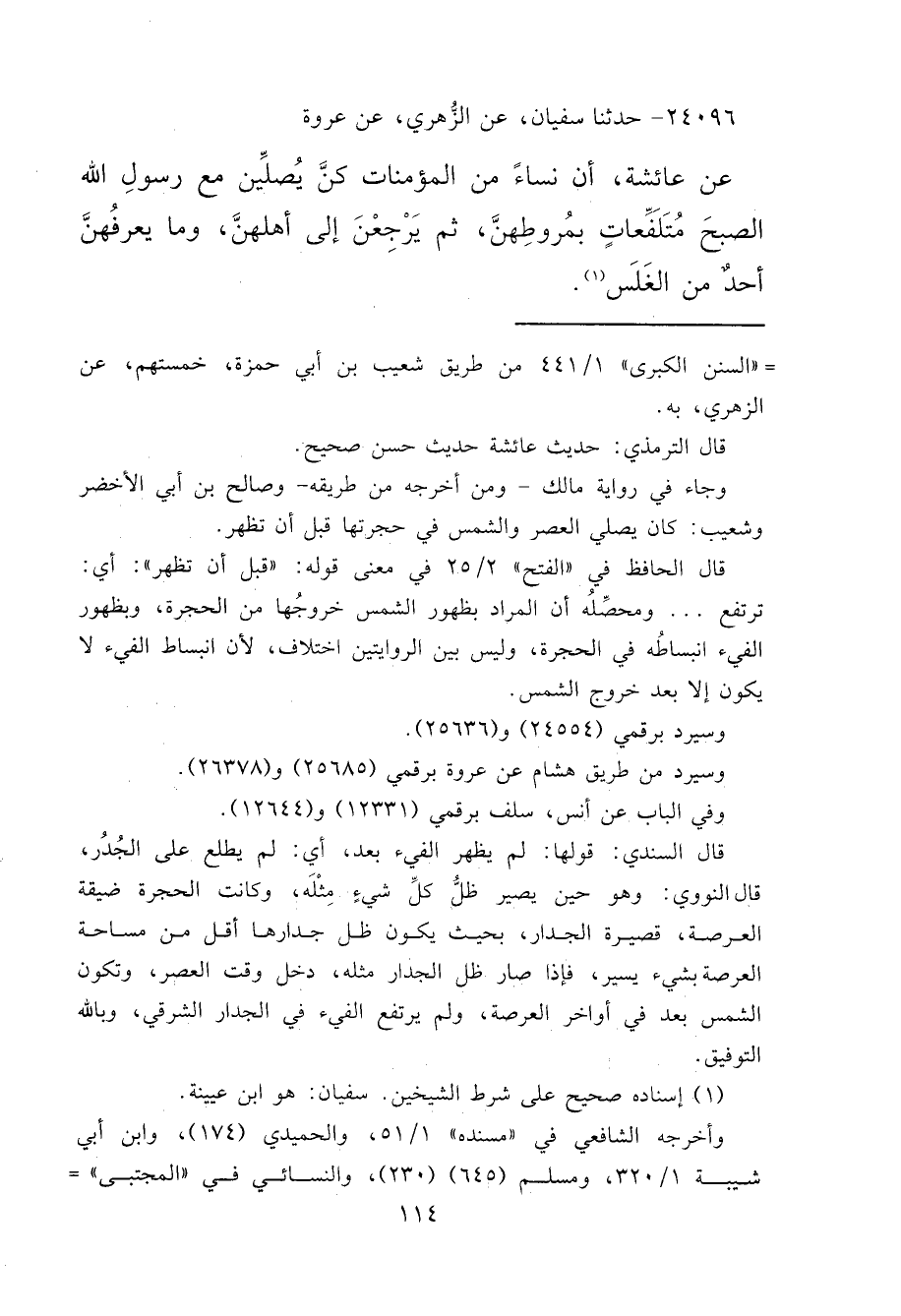 ٢٤٠٩٦ - حَدَّثَنَا سُفْيَانُ، عَنِ الزُّهْرِيِّ، عَنْ عُرْوَةَ، عَنْ عَائِشَةَ، " أَنَّ نِسَاءً مِنَ الْمُؤْمِنَاتِ كُنَّ يُصَلِّينَ مَعَ رَسُولِ اللهِ صَلَّى اللهُ عَلَيْهِ وَسَلَّمَ الصُّبْحَ، مُتَلَفِّعَاتٍ بِمُرُوطِهِنَّ، ثُمَّ يَرْجِعْنَ إِلَى أَهْلِهِنَّ وَمَا يَعْرِفُهُنَّ أَحَدٌ مِنَ الْغَلَسِ " (١)