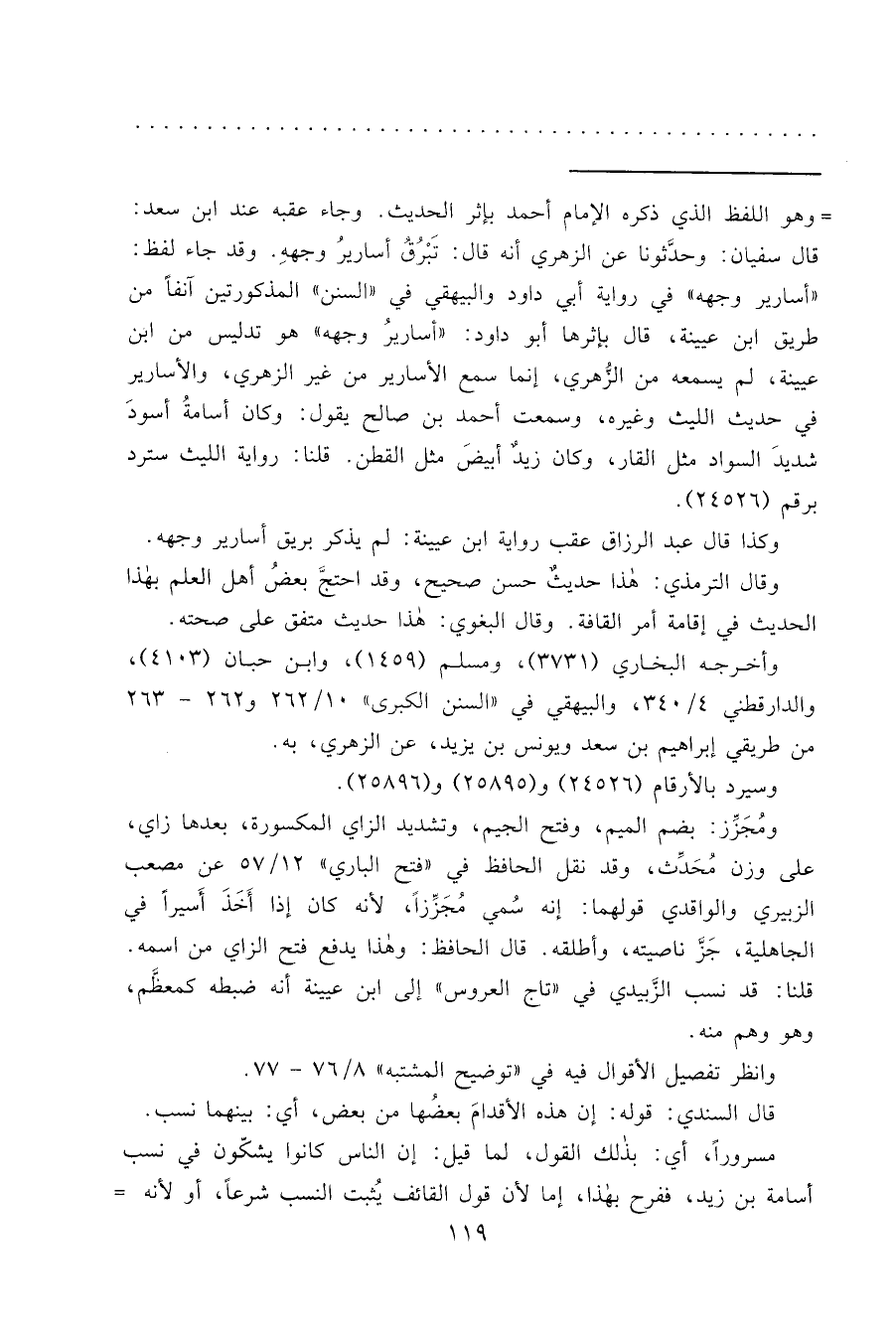 وقال الترمذي: هذا حديثٌ حسن صحيح، وقد احتجَّ بعضُ أهل العلم بهذا الحديث في إقامة أمر القافة. وقال البغوي: هذا حديث متفق على صحته.