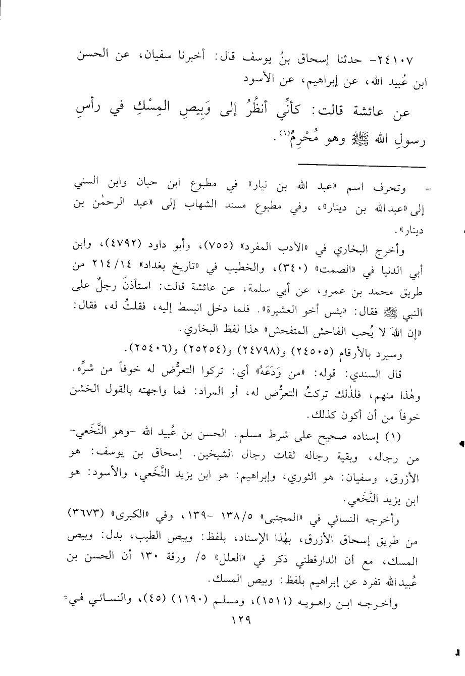 ٢٤١٠٧ - حَدَّثَنَا إِسْحَاقُ بْنُ يُوسُفَ، قَالَ: أَخْبَرَنَا سُفْيَانُ، عَنِ الْحَسَنِ بْنِ عُبَيْدِ اللهِ، عَنْ إِبْرَاهِيمَ، عَنِ الْأَسْوَدِ، عَنْ عَائِشَةَ قَالَتْ: " كَأَنِّي أَنْظُرُ إِلَى وَبِيصِ الْمِسْكِ فِي رَأْسِ رَسُولِ اللهِ صَلَّى اللهُ عَلَيْهِ وَسَلَّمَ وَهُوَ مُحْرِمٌ " (١)
