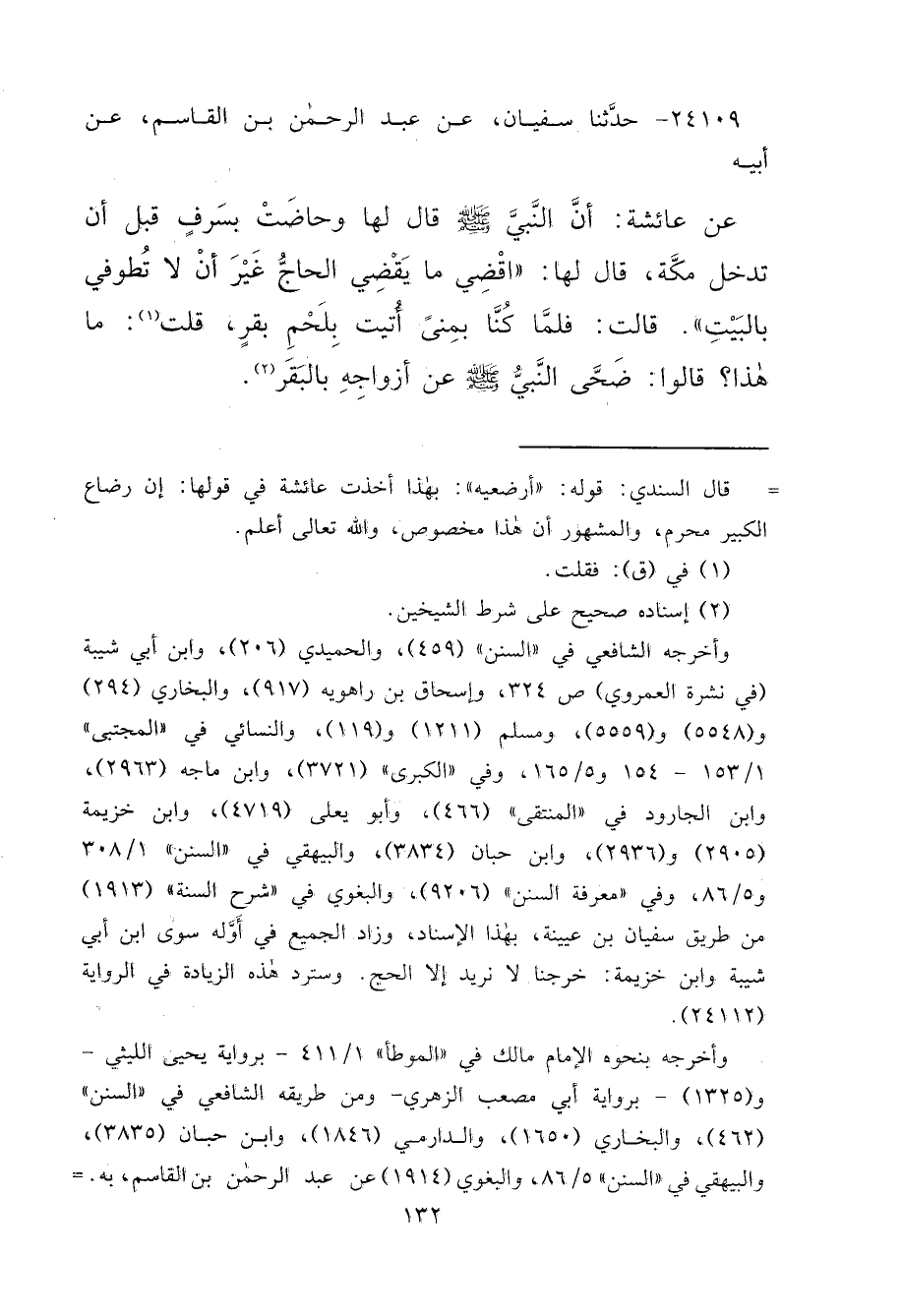 ٢٤١٠٩ - حَدَّثَنَا سُفْيَانُ، عَنْ عَبْدِ الرَّحْمَنِ بْنِ الْقَاسِمِ، عَنْ أَبِيهِ، عَنْ عَائِشَةَ، أَنَّ النَّبِيَّ صَلَّى اللهُ عَلَيْهِ وَسَلَّمَ قَالَ لَهَا وَحَاضَتْ بِسَرِفٍ قَبْلَ أَنْ تَدْخُلَ مَكَّةَ، قَالَ لَهَا: " اقْضِي مَا يَقْضِي الْحَاجُّ غَيْرَ أَنْ لَا تَطُوفِي بِالْبَيْتِ "