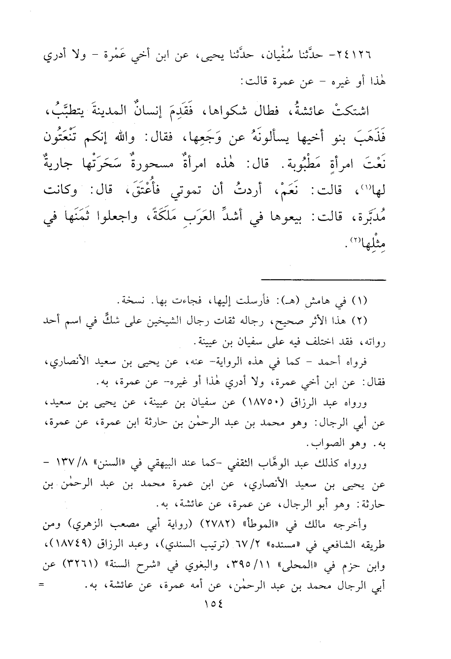 ٢٤١٢٦ - حَدَّثَنَا سُفْيَانُ، حَدَّثَنَا يَحْيَى، عَنِ ابْنِ أَخِي عَمْرَةَ، وَلَا أَدْرِي هَذَا أَوْ غَيْرَهُ، عَنْ عَمْرَةَ قَالَتْ: اشْتَكَتْ عَائِشَةُ فَطَالَ شَكْوَاهَا، فَقَدِمَ إِنْسَانٌ الْمَدِينَةَ يَتَطَبَّبُ، فَذَهَبَ بَنُو أَخِيهَا يَسْأَلُونَهُ، عَنْ وَجَعِهَا، فَقَالَ: وَاللهِ إِنَّكُمْ تَنْعَتُونَ نَعْتَ امْرَأَةٍ مَطْبُوبَةٍ، قَالَ: هَذِهِ امْرَأَةٌ مَسْحُورَةٌ سَحَرَتْهَا جَارِيَةٌ لَهَا (١) ، قَالَتْ: نَعَمْ أَرَدْتُ أَنْ تَمُوتِي فَأُعْتَقَ، قَالَ: وَكَانَتْ مُدَبَّرَةً، قَالَتْ: " بِيعُوهَا فِي أَشَدِّ الْعَرَبِ مَلَكَةً، وَاجْعَلُوا ثَمَنَهَا فِي مِثْلِهَا " (٢)