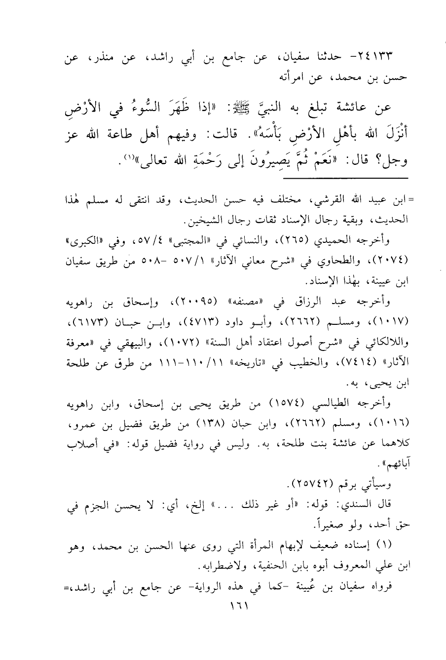 ٢٤١٣٣ - حَدَّثَنَا سُفْيَانُ، عَنْ جَامِعِ بْنِ أَبِي رَاشِدٍ، عَنْ مُنْذِرٍ، عَنْ حَسَنِ بْنِ مُحَمَّدٍ، عَنِ امْرَأَتِهِ، عَنْ عَائِشَةَ، تَبْلُغُ بِهِ النَّبِيَّ صَلَّى اللهُ عَلَيْهِ وَسَلَّمَ: " إِذَا ظَهَرَ السُّوءُ فِي الْأَرْضِ أَنْزَلَ اللهُ بِأَهْلِ الْأَرْضِ بَأْسَهُ " قَالَتْ: وَفِيهِمْ أَهْلُ طَاعَةِ اللهِ عَزَّ وَجَلَّ؟ قَالَ: " نَعَمْ، ثُمَّ يَصِيرُونَ إِلَى رَحْمَةِ اللهِ تَعَالَى " (١)