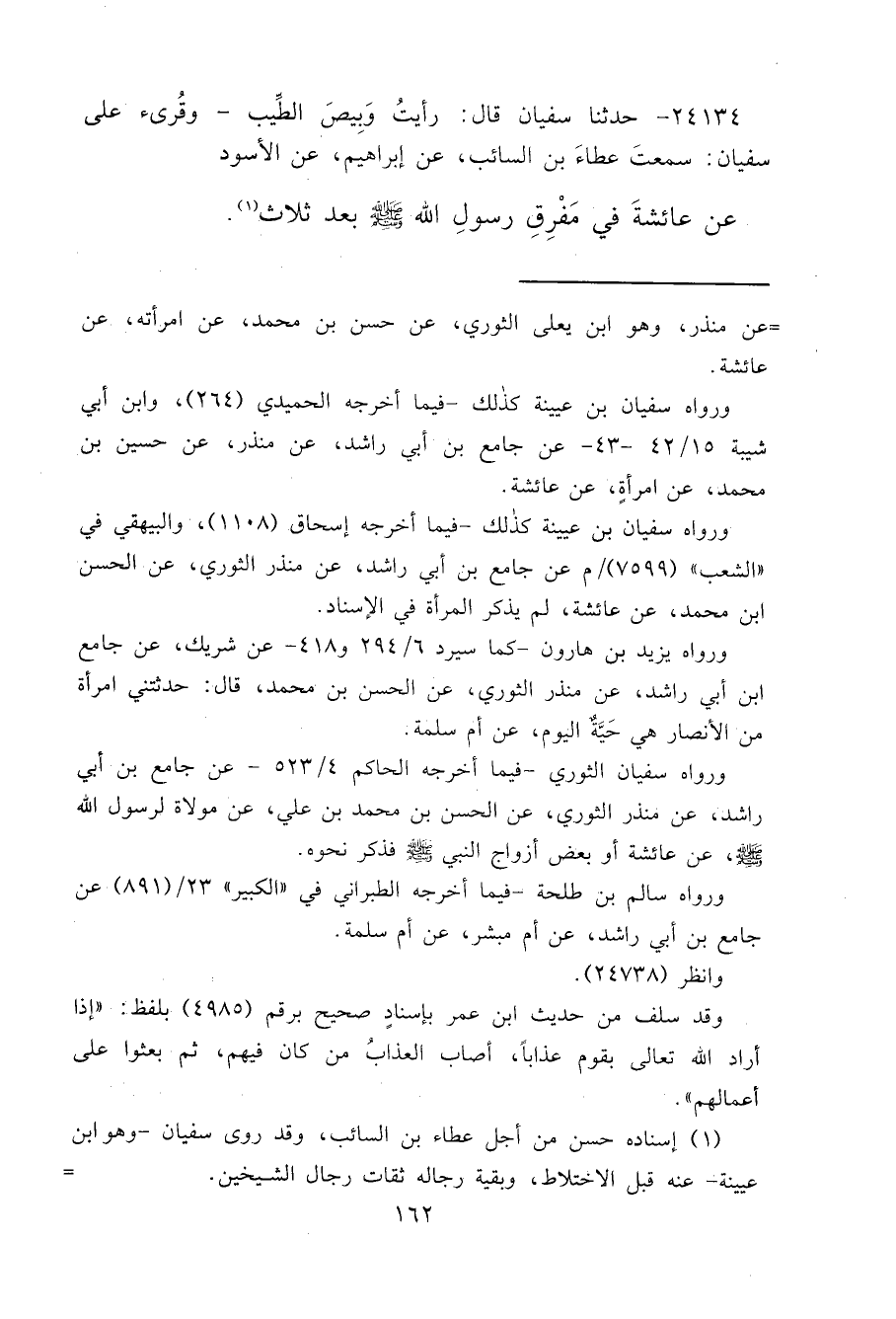 ٢٤١٣٤ - حَدَّثَنَا سُفْيَانُ قَالَ: " رَأَيْتُ وَبِيصَ الطِّيبِ "، وَقُرِئَ عَلَى سُفْيَانَ سَمِعْتُ عَطَاءَ بْنَ السَّائِبِ، عَنْ إِبْرَاهِيمَ، عَنِ الْأَسْوَدِ، عَنْ عَائِشَةَ " فِي مَفْرِقِ رَسُولِ اللهِ صَلَّى اللهُ عَلَيْهِ وَسَلَّمَ بَعْدَ ثَلَاثٍ " (١)