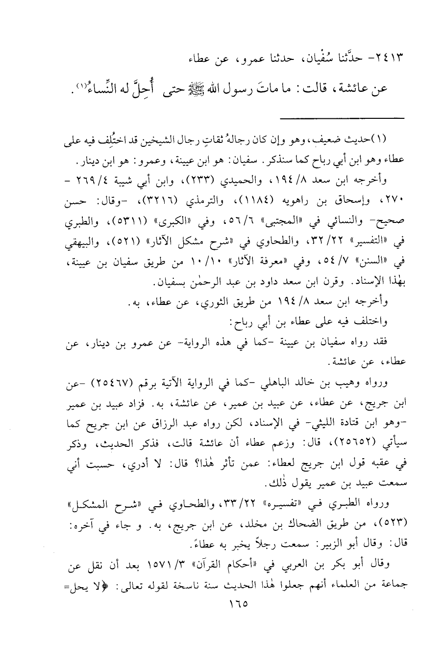 ٢٤١٣٧ - حَدَّثَنَا سُفْيَانُ، حَدَّثَنَا عَمْرٌو، عَنْ عَطَاءٍ، عَنْ عَائِشَةَ قَالَتْ: " مَا مَاتَ رَسُولُ اللهِ صَلَّى اللهُ عَلَيْهِ وَسَلَّمَ حَتَّى أُحِلَّ لَهُ النِّسَاءُ " (١)