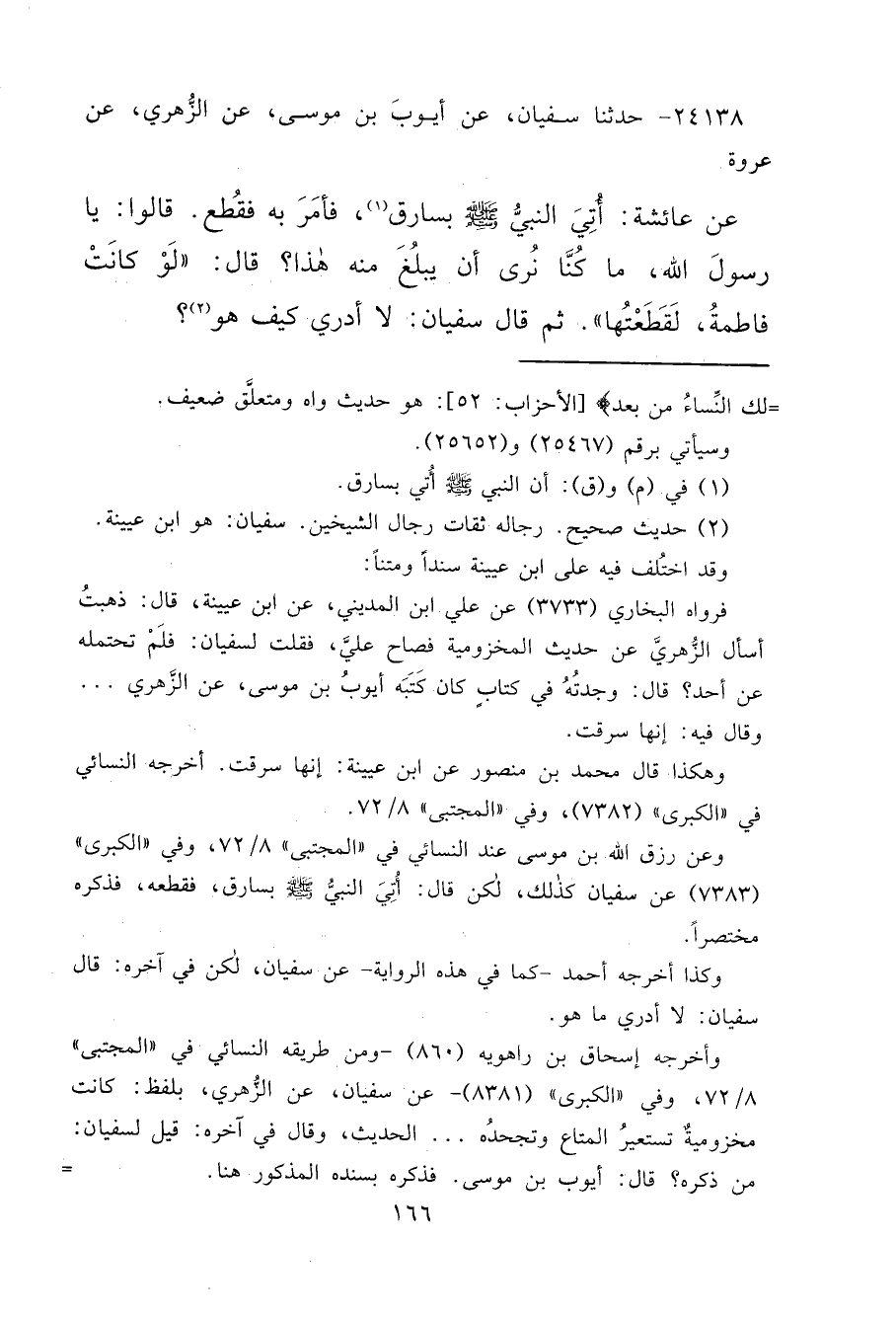 ٢٤١٣٨ - حَدَّثَنَا سُفْيَانُ، عَنْ أَيُّوبَ بْنِ مُوسَى، عَنِ الزُّهْرِيِّ، عَنْ عُرْوَةَ، عَنْ عَائِشَةَ، أُتِيَ النَّبِيَّ صَلَّى اللهُ عَلَيْهِ وَسَلَّمَ بِسَارِقٍ (١) فَأَمَرَ بِهِ فَقُطِعَ، قَالُوا: يَا رَسُولَ اللهِ، مَا كُنَّا نَرَى أَنْ يَبْلُغَ مِنْهُ هَذَا، قَالَ: " لَوْ كَانَتْ فَاطِمَةُ لَقَطَعْتُهَا " ثُمَّ قَالَ سُفْيَانُ: " لَا أَدْرِي كَيْفَ هُوَ (٢) ؟ "