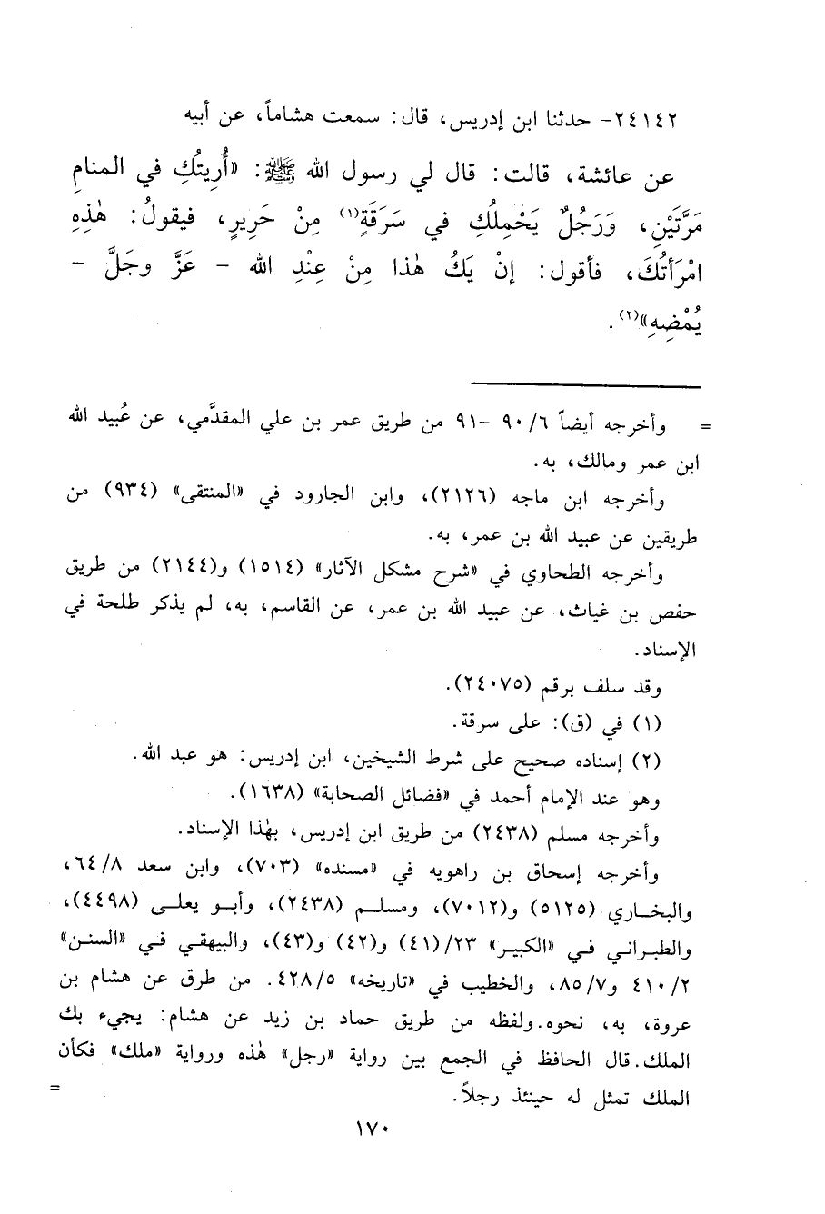 ٢٤١٤٢ - حَدَّثَنَا ابْنُ إِدْرِيسَ قَالَ: سَمِعْتُ هِشَامًا، عَنْ أَبِيهِ، عَنْ عَائِشَةَ قَالَتْ: قَالَ لِي رَسُولُ اللهِ صَلَّى اللهُ عَلَيْهِ وَسَلَّمَ: " أُرِيتُكِ فِي الْمَنَامِ مَرَّتَيْنِ، وَرَجُلٌ يَحْمِلُكِ فِي سَرَقَةٍ (١) مِنْ حَرِيرٍ، فَيَقُولُ: هَذِهِ امْرَأَتُكَ، فَأَقُولُ: إِنْ يَكُ هَذَا مِنْ عِنْدِ اللهِ عَزَّ وَجَلَّ يُمْضِهِ " (٢)