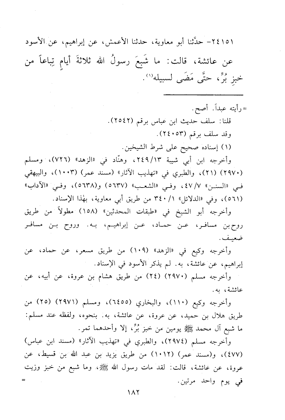 ٢٤١٥١ - حَدَّثَنَا أَبُو مُعَاوِيَةَ، حَدَّثَنَا الْأَعْمَشُ، عَنْ إِبْرَاهِيمَ، عَنِ الْأَسْوَدِ، عَنْ عَائِشَةَ قَالَتْ: مَا " شَبِعَ رَسُولُ اللهِ صَلَّى اللهُ عَلَيْهِ وَسَلَّمَ ثَلَاثَةَ أَيَّامٍ تِبَاعًا مِنْ خُبْزِ بُرٍّ، حَتَّى مَضَى لِسَبِيلِهِ " (١)