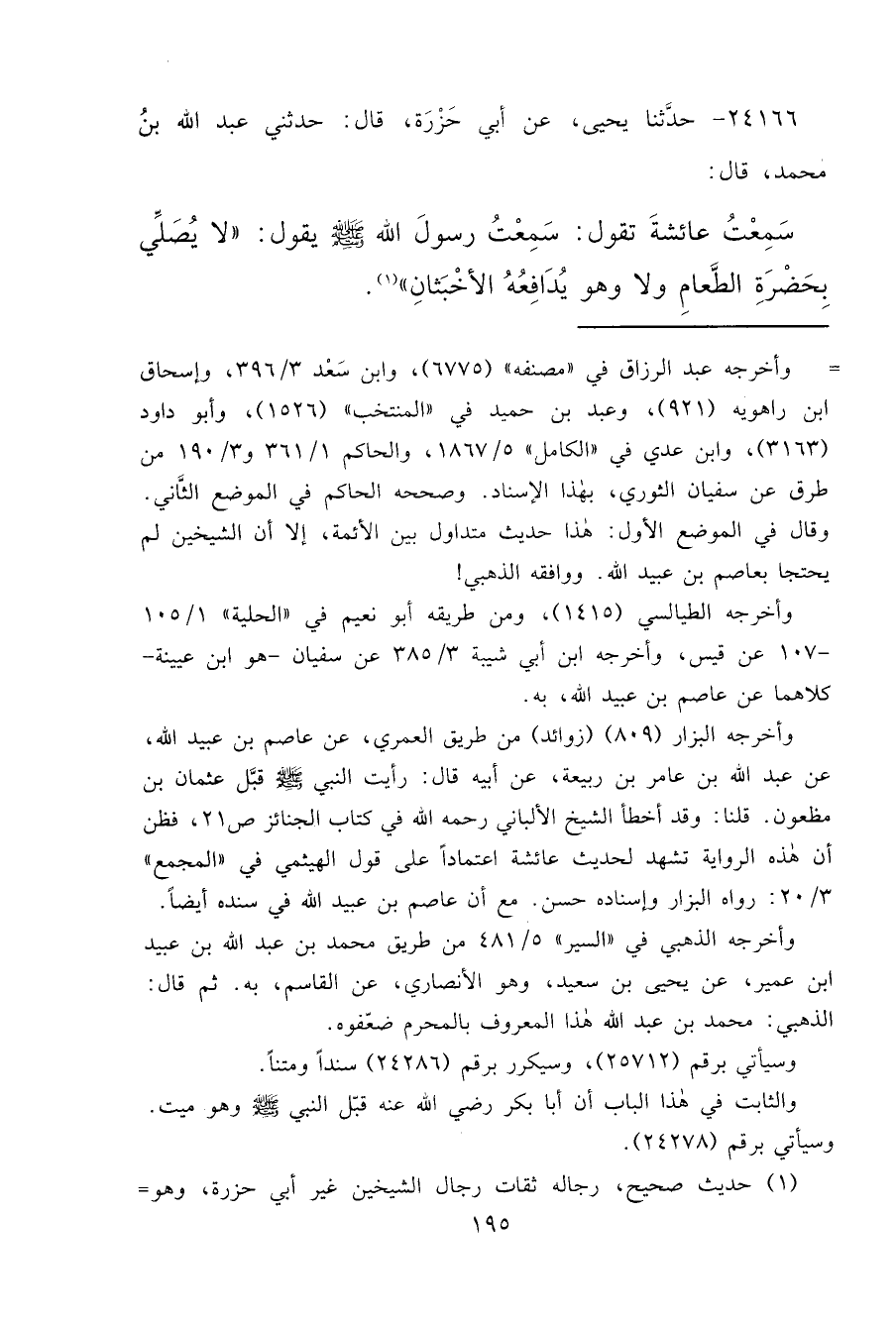 ٢٤١٦٦ - حَدَّثَنَا يَحْيَى، عَنْ أَبِي حَزْرَةَ قَالَ: حَدَّثَنِي عَبْدُ اللهِ بْنُ مُحَمَّدٍ قَالَ: سَمِعْتُ عَائِشَةَ تَقُولُ: سَمِعْتُ رَسُولَ اللهِ صَلَّى اللهُ عَلَيْهِ وَسَلَّمَ يَقُولُ: " لَا يُصَلَّى بِحَضْرَةِ الطَّعَامِ، وَلَا وَهُوَ يُدَافِعُهُ الْأَخْبَثَانِ " (١)