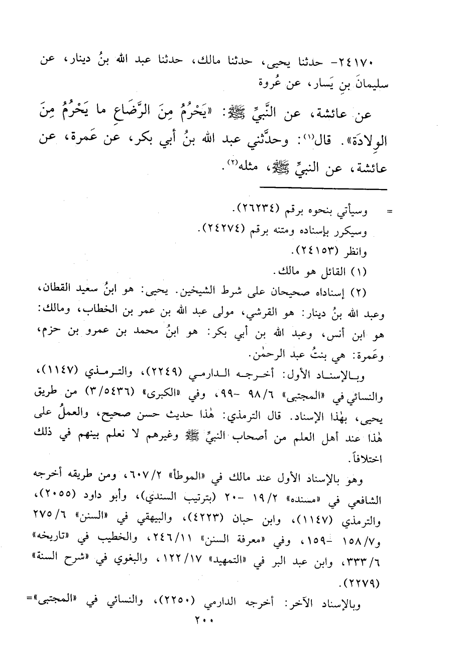 ٢٤١٧٠ - حَدَّثَنَا يَحْيَى، حَدَّثَنَا مَالِكٌ، حَدَّثَنَا عَبْدُ اللهِ بْنُ دِينَارٍ، عَنْ سُلَيْمَانَ بْنِ يَسَارٍ، عَنْ عُرْوَةَ، عَنْ عَائِشَةَ، عَنِ النَّبِيِّ صَلَّى اللهُ عَلَيْهِ وَسَلَّمَ: " يَحْرُمُ مِنَ الرَّضَاعِ مَا يَحْرُمُ مِنَ الْوِلَادَةِ " قَالَ (١) : وَحَدَّثَنِي عَبْدُ اللهِ بْنُ أَبِي بَكْرٍ، عَنْ عَمْرَةَ، عَنْ عَائِشَةَ، عَنِ النَّبِيِّ صَلَّى اللهُ عَلَيْهِ وَسَلَّمَ مِثْلَهُ (٢)