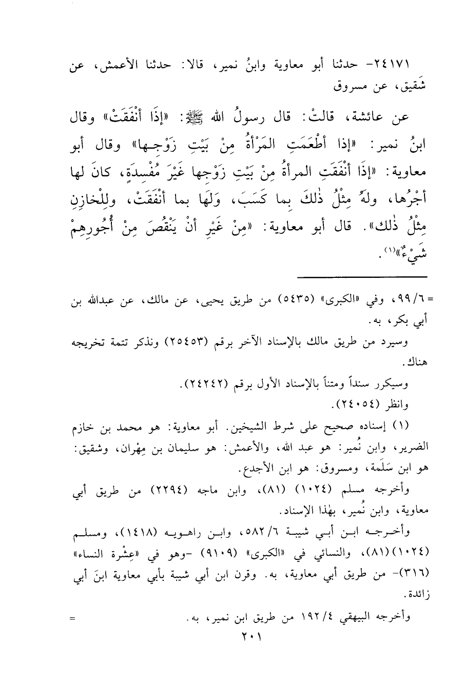 ٢٤١٧١ - حَدَّثَنَا أَبُو مُعَاوِيَةَ، وَابْنُ نُمَيْرٍ، قَالَا: حَدَّثَنَا الْأَعْمَشُ، عَنْ شَقِيقٍ، عَنْ مَسْرُوقٍ، عَنْ عَائِشَةَ قَالَتْ: قَالَ رَسُولُ اللهِ صَلَّى اللهُ عَلَيْهِ وَسَلَّمَ: " إِذَا أَنْفَقَتْ " وَقَالَ ابْنُ نُمَيْرٍ: " إِذَا أَطْعَمَتِ الْمَرْأَةُ مِنْ بَيْتِ زَوْجِهَا " وَقَالَ أَبُو مُعَاوِيةَ: " إِذَا أَنْفَقَتِ الْمَرْأَةُ مِنْ بَيْتِ زَوْجِهَا غَيْرَ مُفْسِدَةٍ، كَانَ لَهَا أَجْرُهَا، وَلَهُ مِثْلُ ذَلِكَ بِمَا كَسَبَ، وَلَهَا بِمَا أَنْفَقَتْ، وَلِلْخَازِنِ مِثْلُ ذَلِكَ " قَالَ أَبُو مُعَاوِيَةَ: " مِنْ غَيْرِ أَنْ يَنْقُصَ مِنْ أُجُورِهِمْ شَيْءٌ " (١)