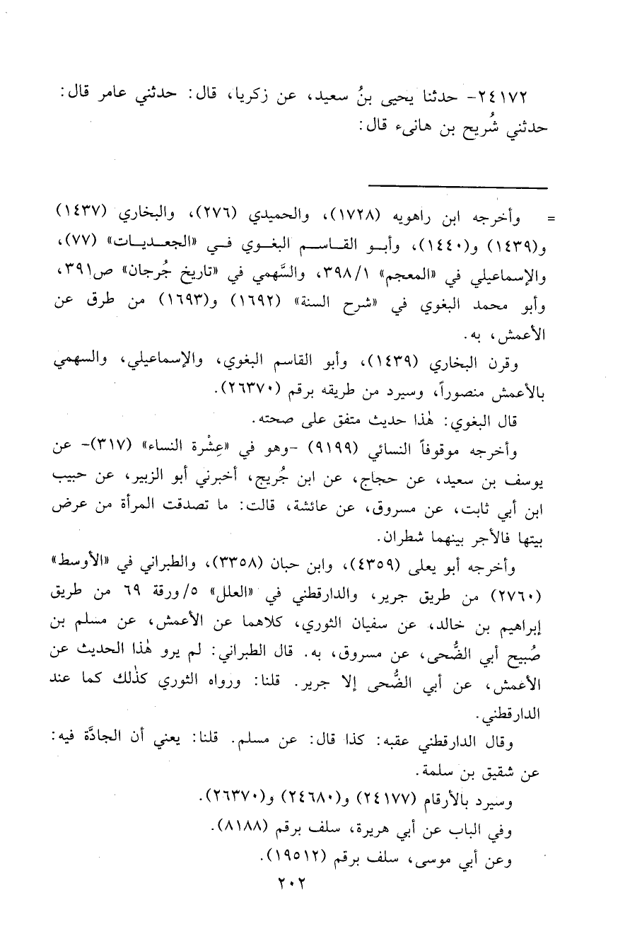 ٢٤١٧٢ - حَدَّثَنَا يَحْيَى بْنُ سَعِيدٍ، عَنْ زَكَرِيَّا قَالَ: حَدَّثَنِي عَامِرٌ قَالَ: حَدَّثَنِي شُرَيْحُ بْنُ هَانِئٍ قَالَ: