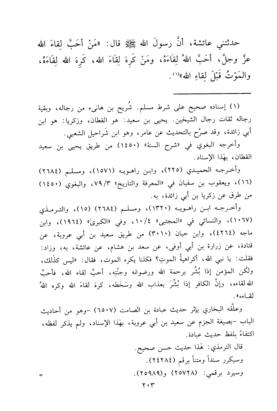وأخرجه ابن راهوية (١٣٢٠) ، ومسلم (٢٦٨٤) (١٥) ، والترمذي (١٠٦٧) ، والنسائي في "المجتبى" ٤/١٠، وفي "الكبرى" (١٩٦٤) ، وابن ماجه (٤٢٦٤) ، وابن حبان (٣٠١٠) من طريق سعيد بن أبي عروبة، عن قتادة، عن زيارة بن أبي أوفى، عن سعد بن هشام، عن عائشة، به، وزاد: فقلت: يا نبي الله، أكراهيةُ الموتِ؟ فكلنا يكره الموت، فقال: "ليس كذلك، ولكن المؤمن إذا بُشِّر برحمة الله ورضوانه وجنَّتِه، أحب لقاء الله، فأحب الله لقاءه، وإنَّ الكافر إذا بُشِّرَ بعذاب الله وسَخَطه، كرهَ لقاءَ الله وكره اللهُ لقاءه".