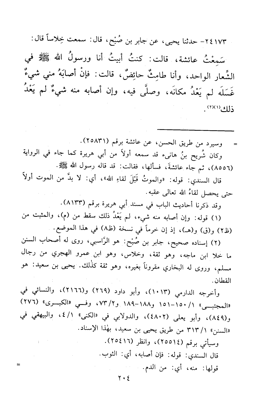 ٢٤١٧٣ - حَدَّثَنَا يَحْيَى، عَنْ جَابِرِ بْنِ صُبْحٍ قَالَ: سَمِعْتُ خِلَاسًا قَالَ: سَمِعْتُ عَائِشَةَ قَالَتْ: " كُنْتُ أَبِيتُ أَنَا وَرَسُولُ اللهِ صَلَّى اللهُ عَلَيْهِ وَسَلَّمَ فِي الشِّعَارِ الْوَاحِدِ، وَأَنَا طَامِثٌ حَائِضٌ "، قَالَتْ: " فَإِنْ أَصَابَهُ مِنِّي شَيْءٌ غَسَلَهُ، لَمْ يَعْدُ مَكَانَهُ، وَصَلَّى فِيهِ وَإِنْ أَصَابَهٌ مٍنْهُ شَيْءٌ لَمْ يَعُدَّ ذَلِكَ (١) " (٢)