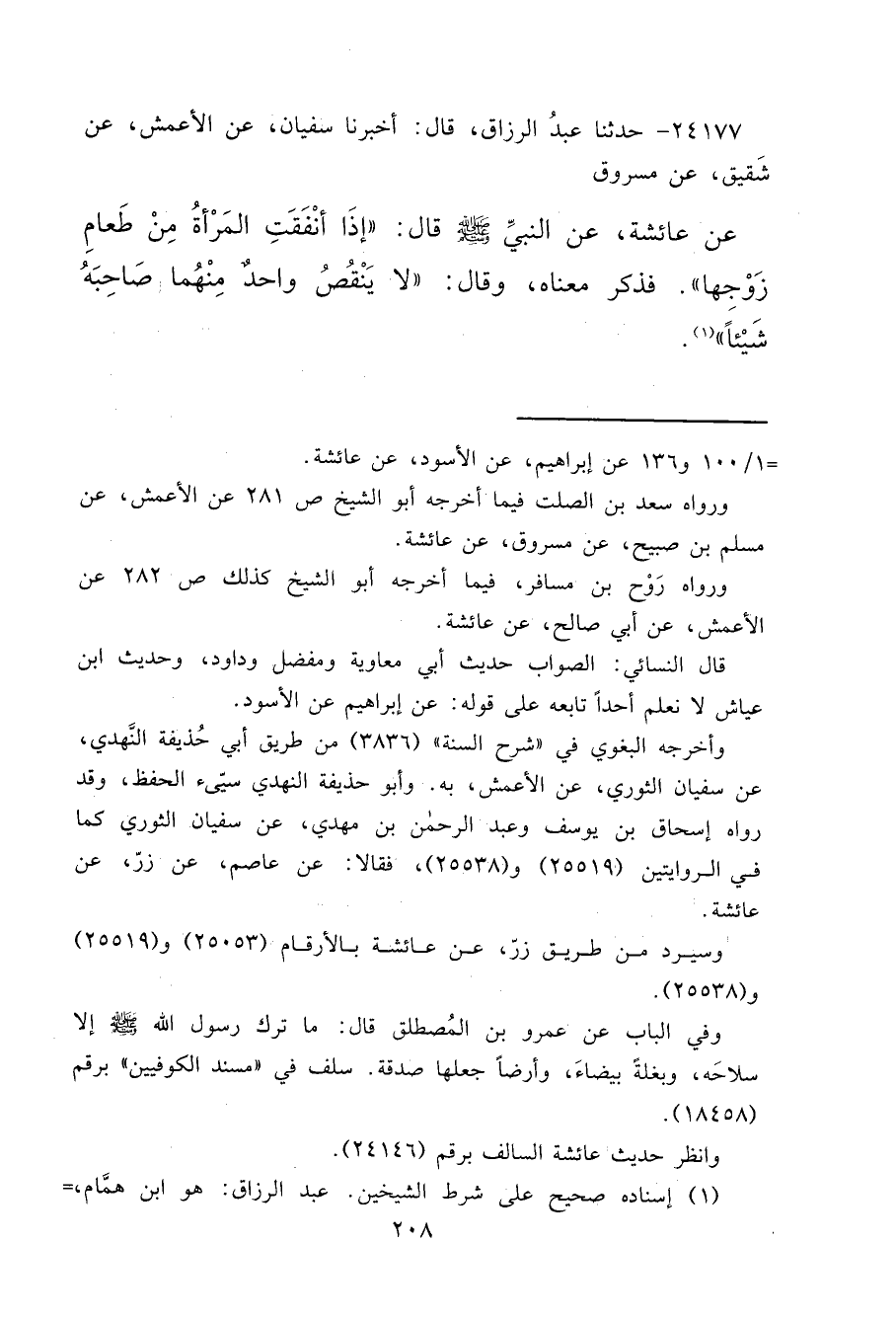 ٢٤١٧٧ - حَدَّثَنَا عَبْدُ الرَّزَّاقِ قَالَ: أَخْبَرَنَا سُفْيَانُ، عَنِ الْأَعْمَشِ، عَنْ شَقِيقٍ، عَنْ مَسْرُوقٍ، عَنْ عَائِشَةَ، عَنِ النَّبِيِّ صَلَّى اللهُ عَلَيْهِ وَسَلَّمَ قَالَ: " إِذَا أَنْفَقَتِ الْمَرْأَةُ مِنْ طَعَامِ زَوْجِهَا " فَذَكَرَ مَعْنَاهُ، وَقَالَ: " لَا يَنْقُصُ وَاحِدٌ مِنْهُمَا صَاحِبَهُ شَيْئًا " (١)